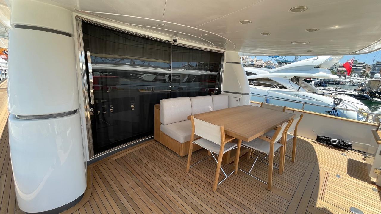 Allarme motore, Allarme sentina, Autoclave, Bocche di Lupa, Camminamenti laterali in teak, Doccia esterna, Doppia timoneria, Faro orientabile, Flap idraulici, Gruette per tender su fly, Impianto antincendio, Indicatori Flaps, Luci di cortesia, Luci subacquee, Passerella, Piattaforma, Ponte in teak, Porta ingresso, Porta laterale, Pozzetto Teak, Presa 220V banchina, Presa acqua banchina, Rollbar, Salpa Ancore Elettrico, Scaletta da bagno, Selle per Tender, Tavolo pozzetto, Tender, Tromba, Winch tonneggio di poppa.