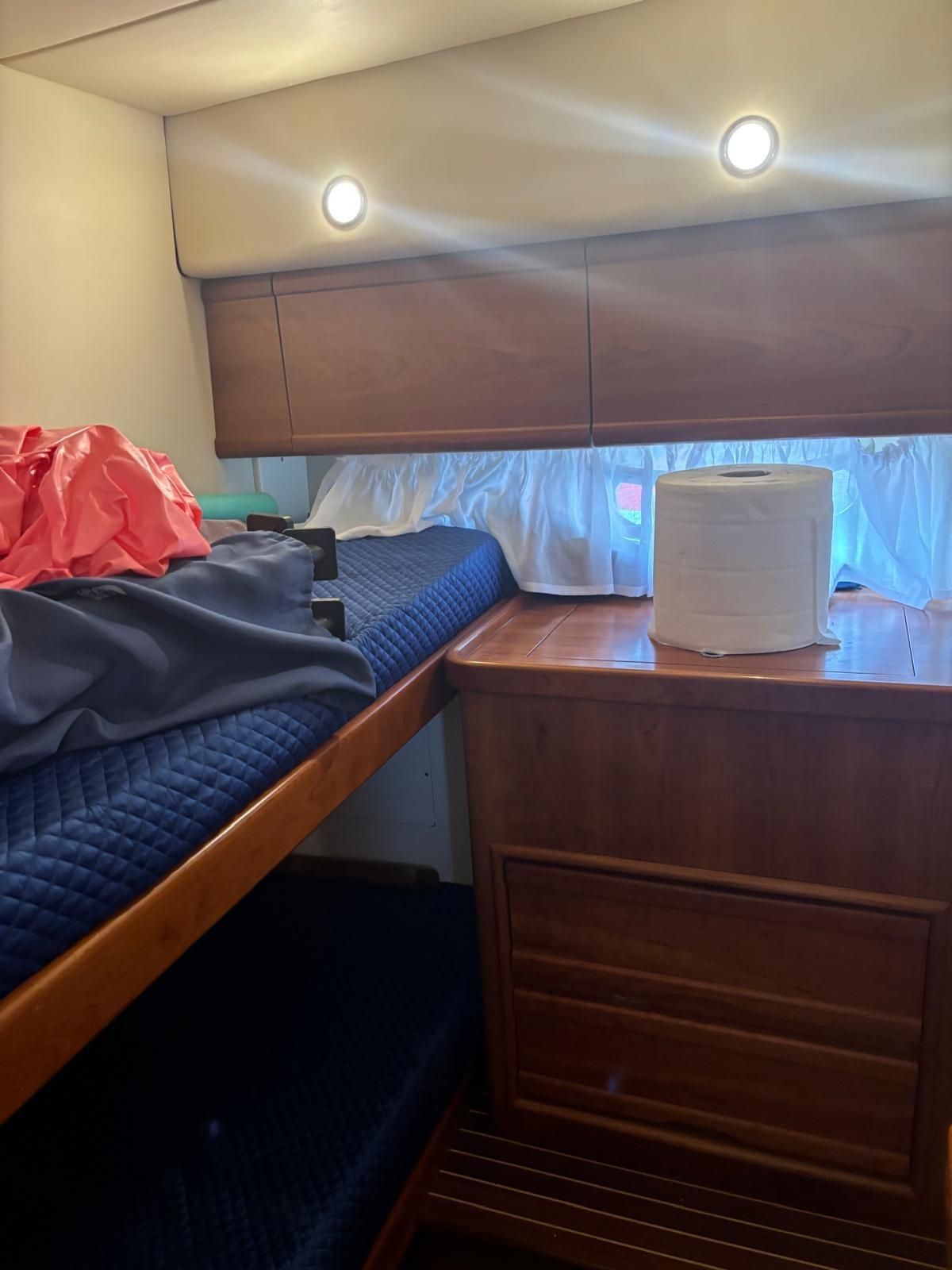 Cabina armatoriale con letto matrimoniale - cabina ospiti con due letti a castello - bagno.