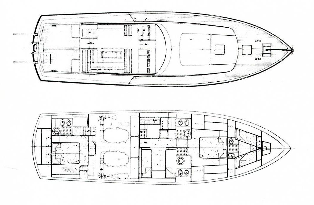 Cabina armatoriale con letto matrimoniale e bagno - cabina ospiti con due letti e bagno - cabina ospiti a poppa con letto matrimoniale e bagno - cabina marinaio con servizi.