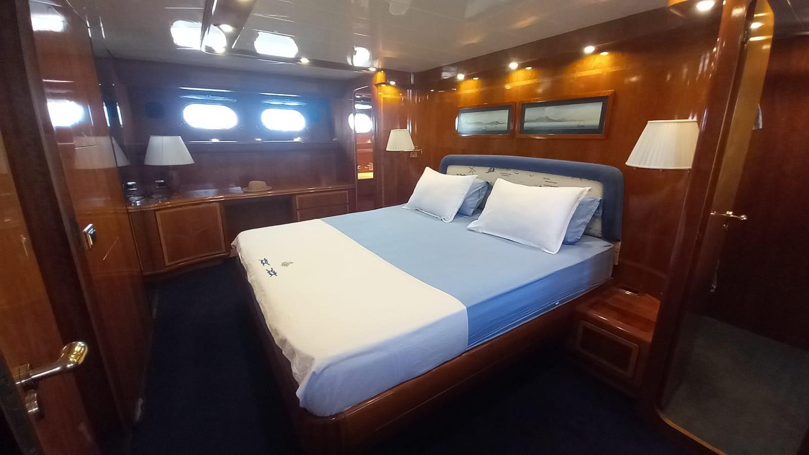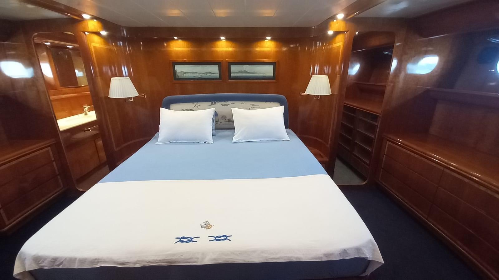 Cabina armatoriale con letto matrimoniale, cabina armadio e bagno con doccia separata - cabina Vip con due letti in piano e bagno - cabina ospiti con due letti in piano e bagno - cabina ospiti con due letti in piano e bagno.