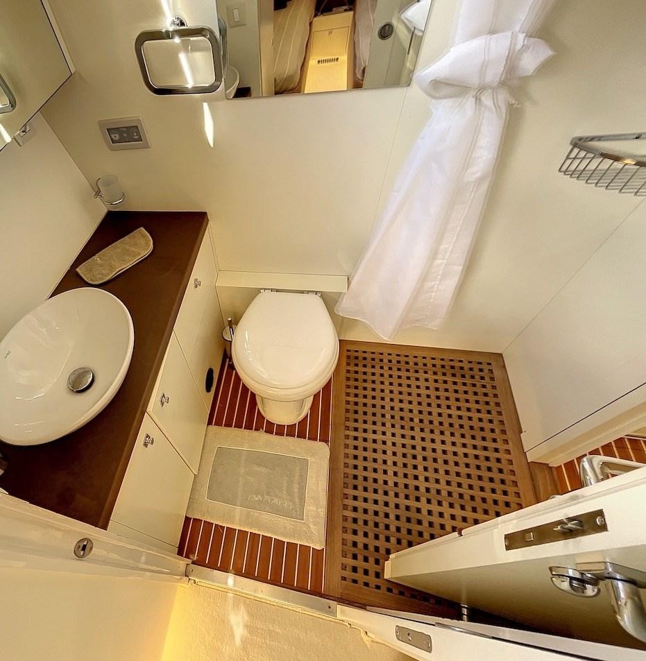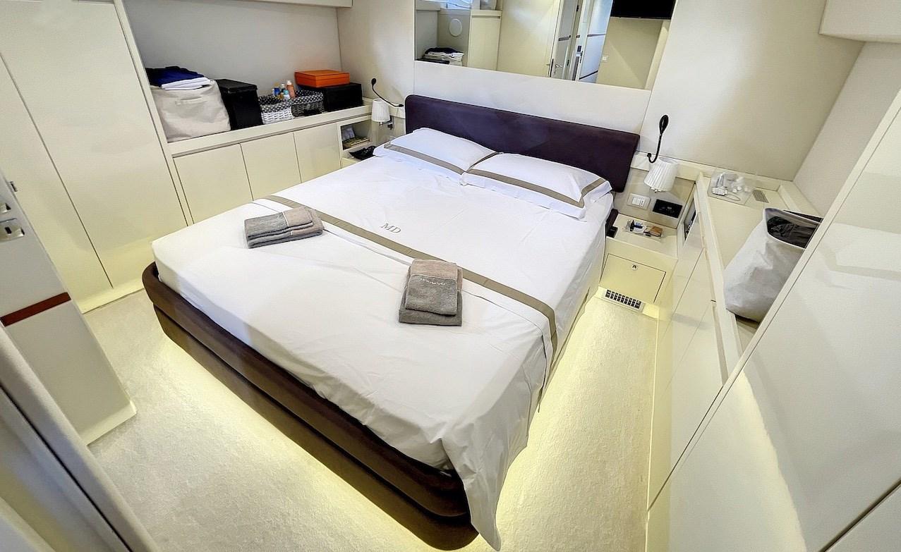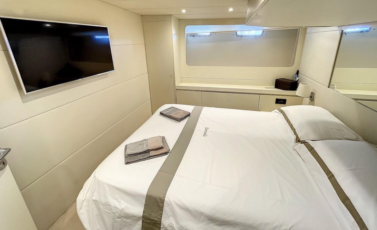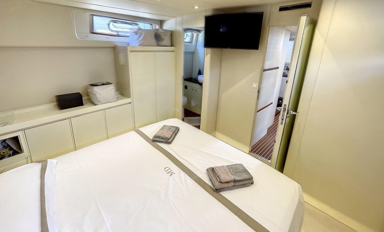 Cabina armatoriale con letto matrimoniale e bagno - cabina ospiti con due letti e bagno - cabina ospiti a poppa con letto matrimoniale e bagno - cabina marinaio con servizi.