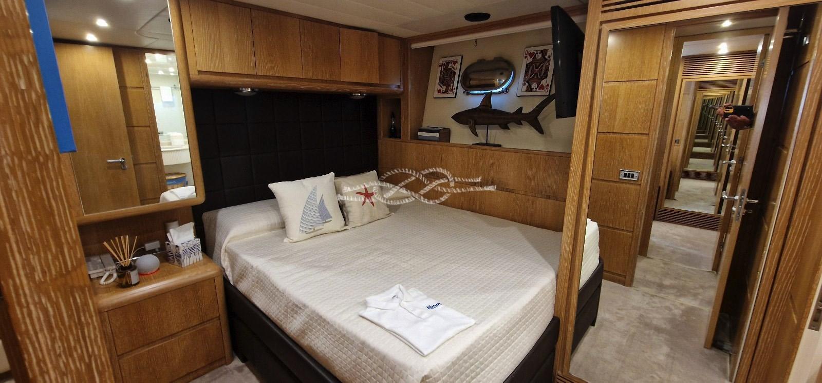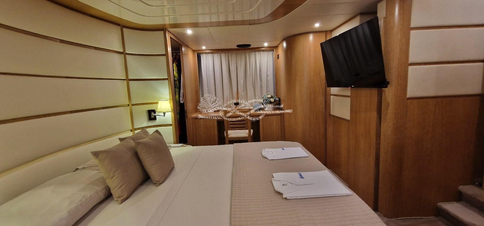 Cabina armatoriale con letto matrimoniale, cabina armadio e bagno - cabina Vip con letto matrimoniale e bagno - cabina ospiti con letto matrimoniale e bagno - cabina ospiti con due letti separati e bagno - cabina equipaggio con servizi.