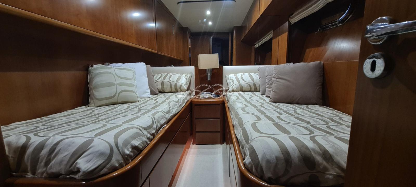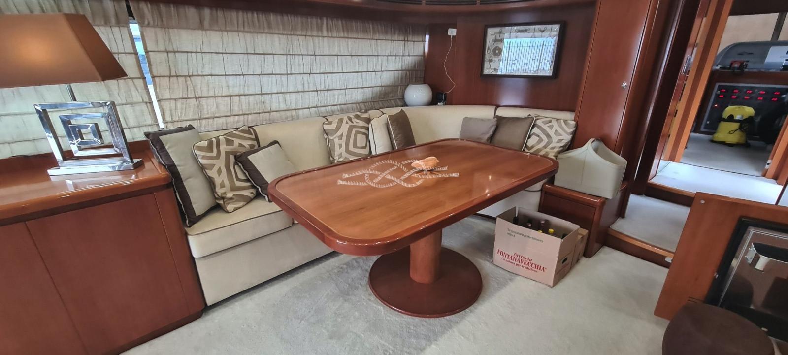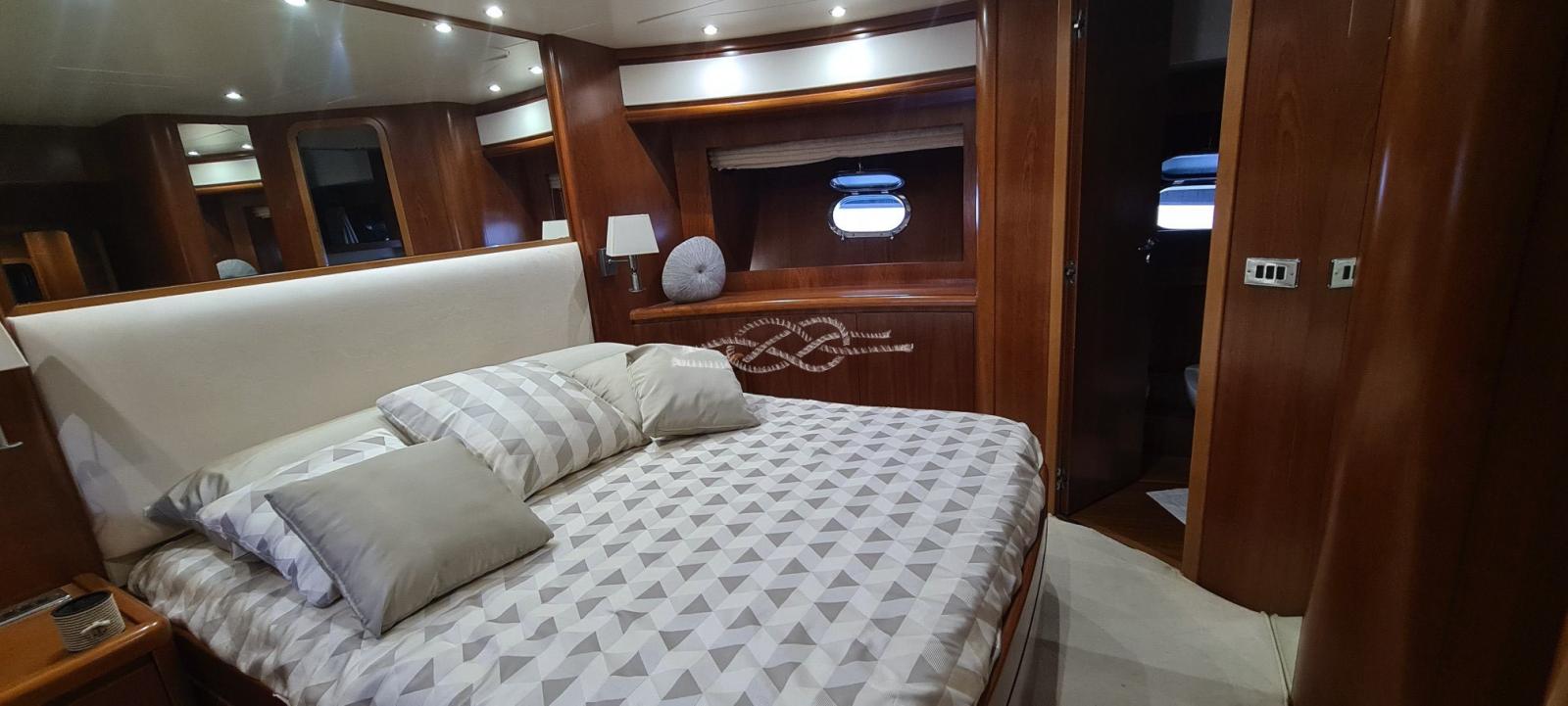 Salone con divano a "L" e tavolo pranzo - day toilet - plancia con dinette - cucina - cabina armatoriale con letto matrimoniale, bagno con doccia separata, cabina armadio - cabina vip con letto matrimoniale, bagno con doccia separata, armadio - cabina ospiti con letto alla francese, letto pullman, bagno e doccia separata - cabina ospiti con letti in piano, letto pullman, bagno con doccia separata.