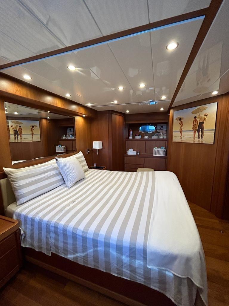 Cabina armatoriale con letto matrimoniale ,cabina armadio e bagno - cabina Vip on letto matrimoniale e bagno - cabina ospiti con due letti in piano, terzo letto a scomparsa e bagno - cabina ospiti singola con letto a scomparsa e bagno.