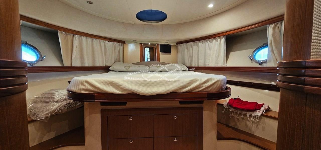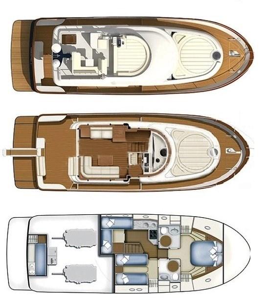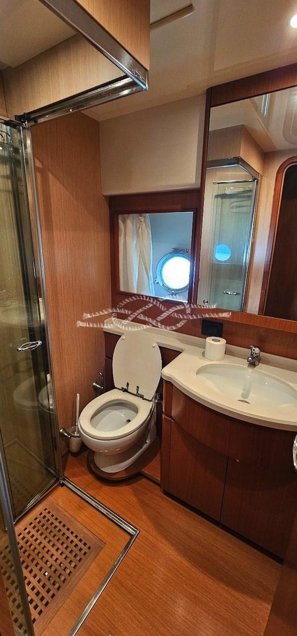 Cabina armatoriale con letto matrimoniale e bagno con box doccia (senza bidet) - cabina ospiti con due letti in piano - cabina ospiti con due letti incrociati - bagno ospiti con box doccia (senza bidet).