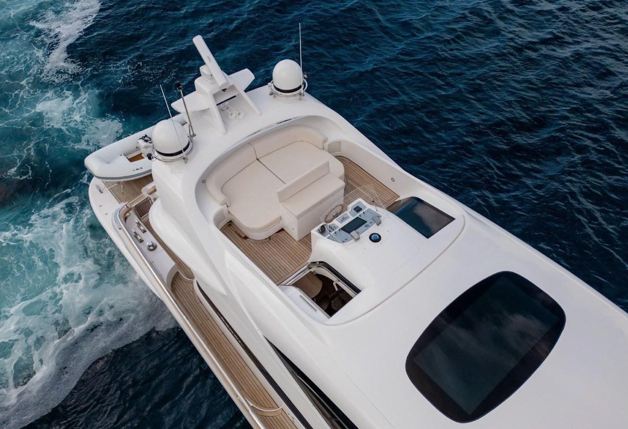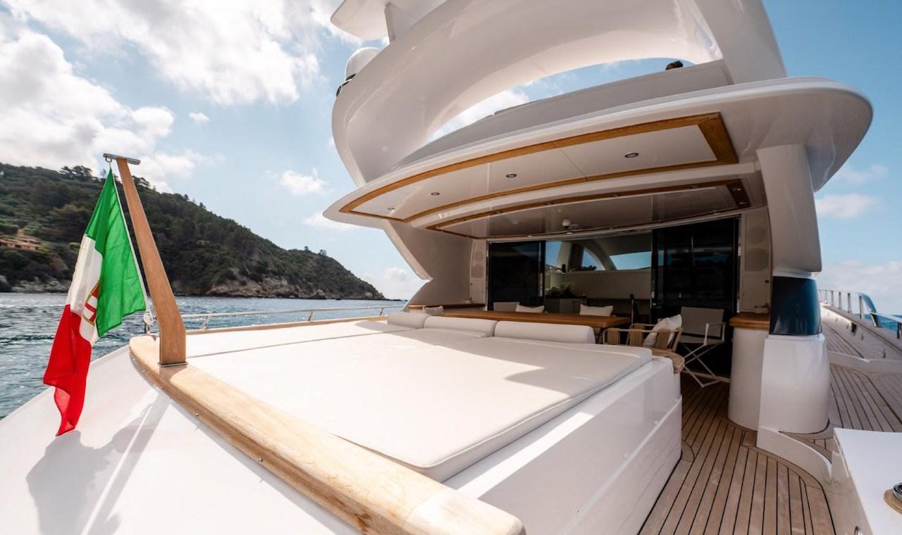 Allarme motore, Allarme sentina, Autoclave, Bocche di Lupa, Camminamenti laterali in teak, Doccia esterna, Doppia timoneria, Flap idraulici, Gruette per tender, Impianto antincendio, Indicatori Flaps, Luci di cortesia, Luci subacquee, Passerella, Piattaforma, Porta ingresso, Porta laterale, Pozzetto Teak, Presa 220V banchina, Presa acqua banchina, Raddrizzatore, Rollbar, Salpa Ancore Elettrico, Scaletta da bagno, Selle per Tender, Tavolo pozzetto, Tender, Tientibene con cancelletti, Tromba, Winch tonneggio di poppa, Winch tonneggio di prua.