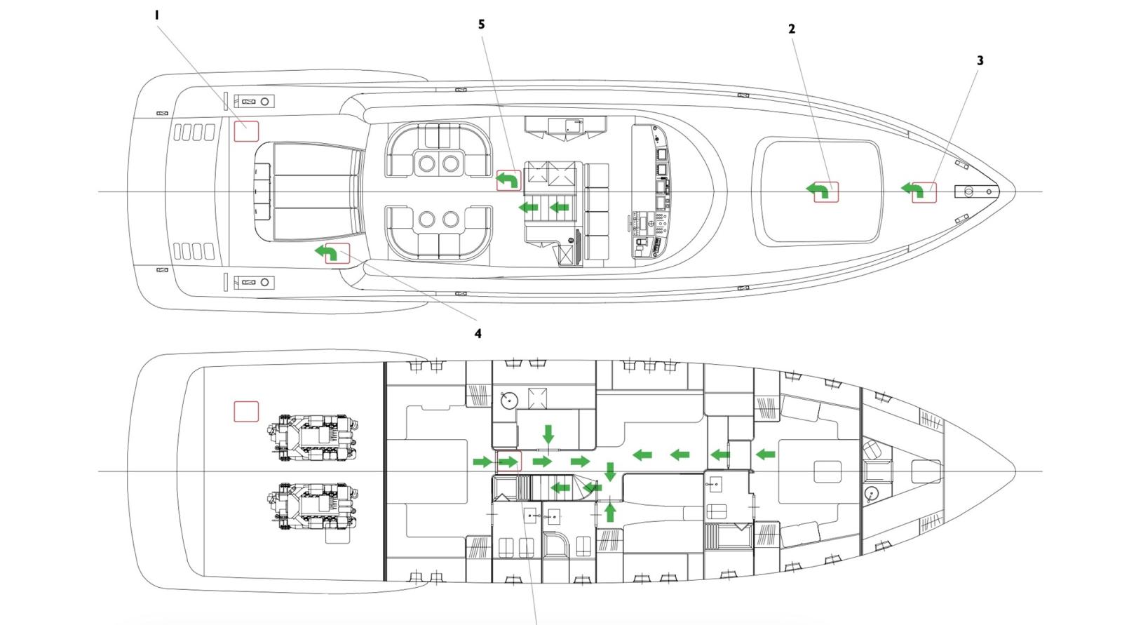 Allarme fumo/gas, Allarme motore, Allarme sentina, Alternatore, Autoclave, Bocche di Lupa, Camminamenti laterali in teak, Doccia esterna, Faro orientabile, Flap idraulici, Garage per tender, Hard top, Impianto antincendio, Indicatori Flaps, Lavaggio catena, Lavandino nel Pozzetto, Luci di cortesia, Luci subacquee, Passerella, Piattaforma, Pompa di sentina automatica, Pompa di sentina manuale, Ponte in teak, Pozzetto Teak, Presa 220V banchina, Presa acqua banchina, Raddrizzatore, Salpa Ancore Elettrico, Scaletta da bagno, Selle per Tender, Tavolo pozzetto, Tender, Tromba, Winch tonneggio di poppa.