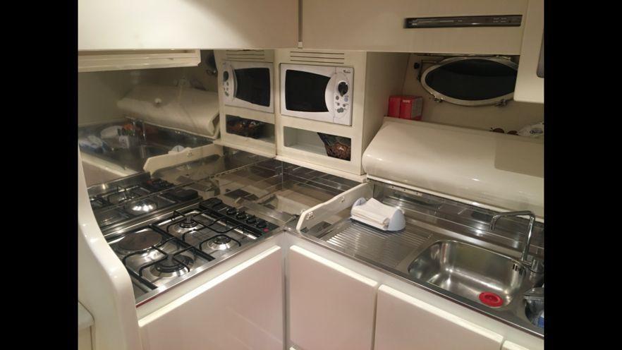 Passerella elettro-idraulica - gruppo elettrogeno Kohler 6,5 kW - piano cottura 4 fuochi a gas - frigo - freezer - microonde - antenna TV - TV LCD - mobile bar in pozzetto con lavello e piano cottura 2 fuochi a gas - elica di prua elettrica Side Power - dissalatore Schenker.