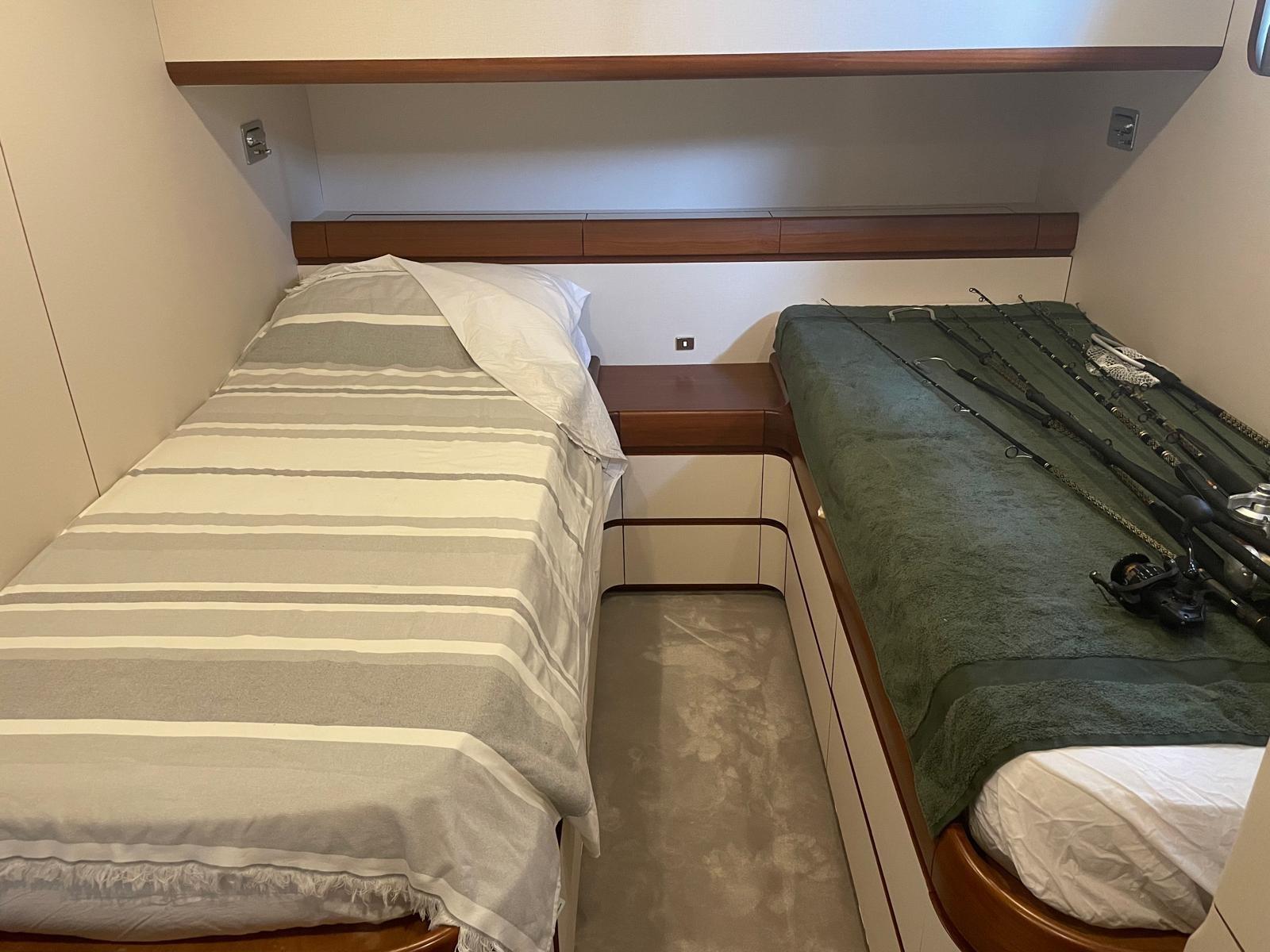 Cabina armatoriale con letto matrimoniale e bagno (wc, bidet e doccia separata) - cabina ospiti con due letti in piano e bagno (wc, bidet e doccia separata) - cabina ospiti con due letti in piano e bagno (wc, bidet e doccia separata) - cabina ospiti con due letti in piano, terzo letto a socmparsa e bagno (wc, bidet e doccia separata).