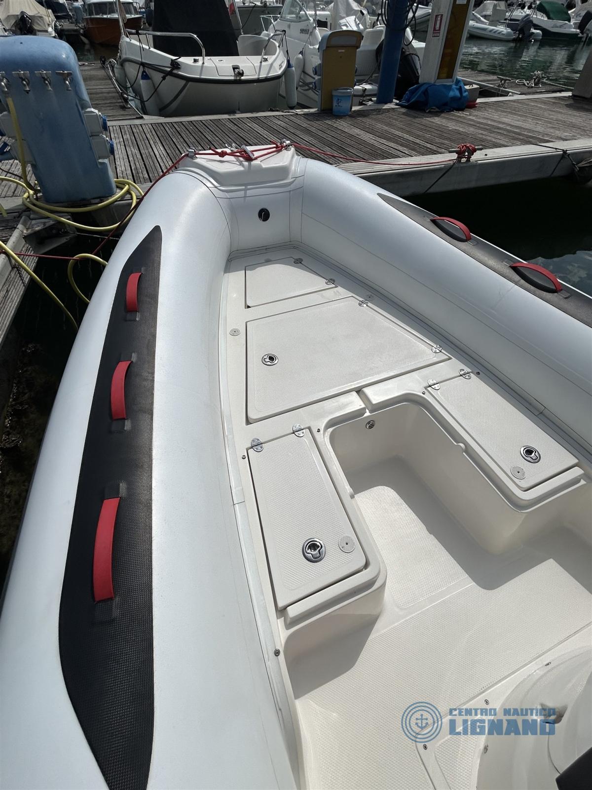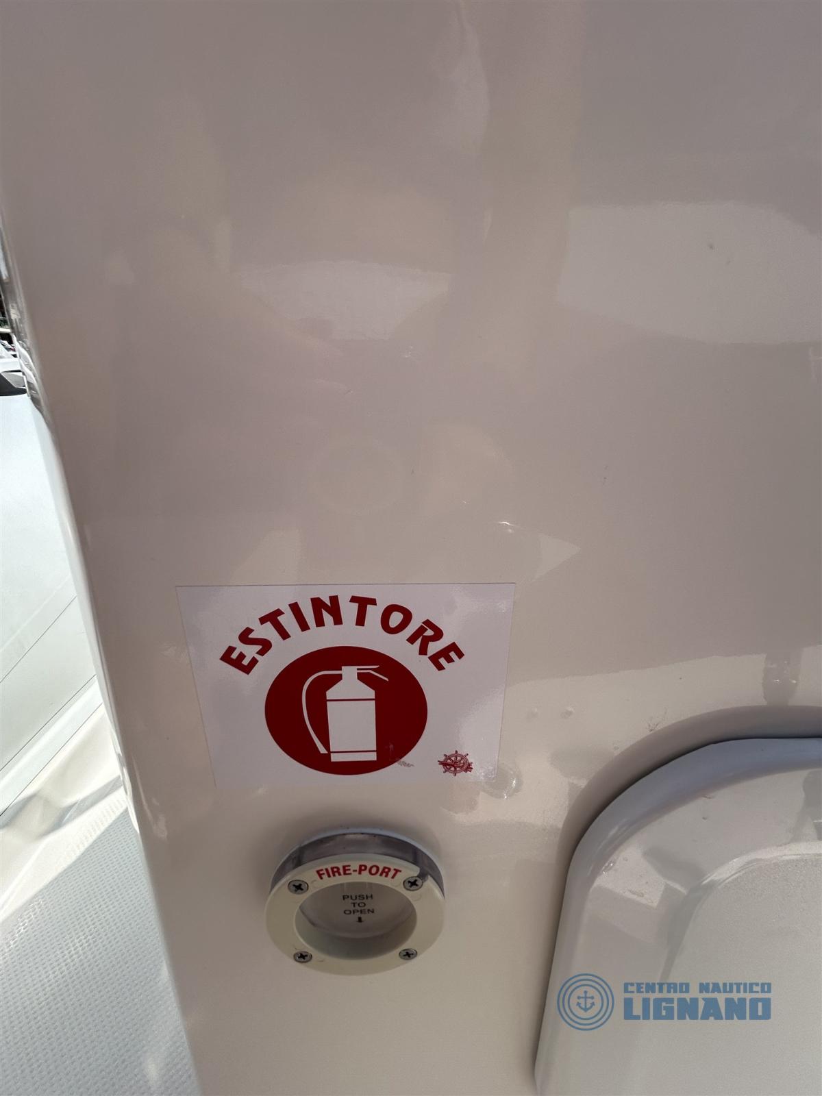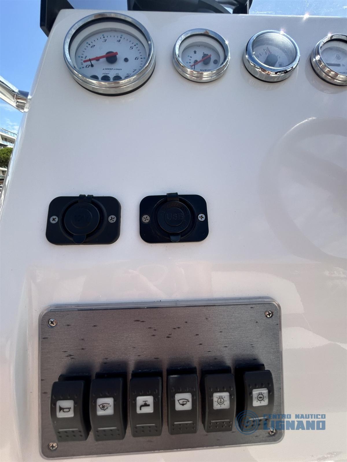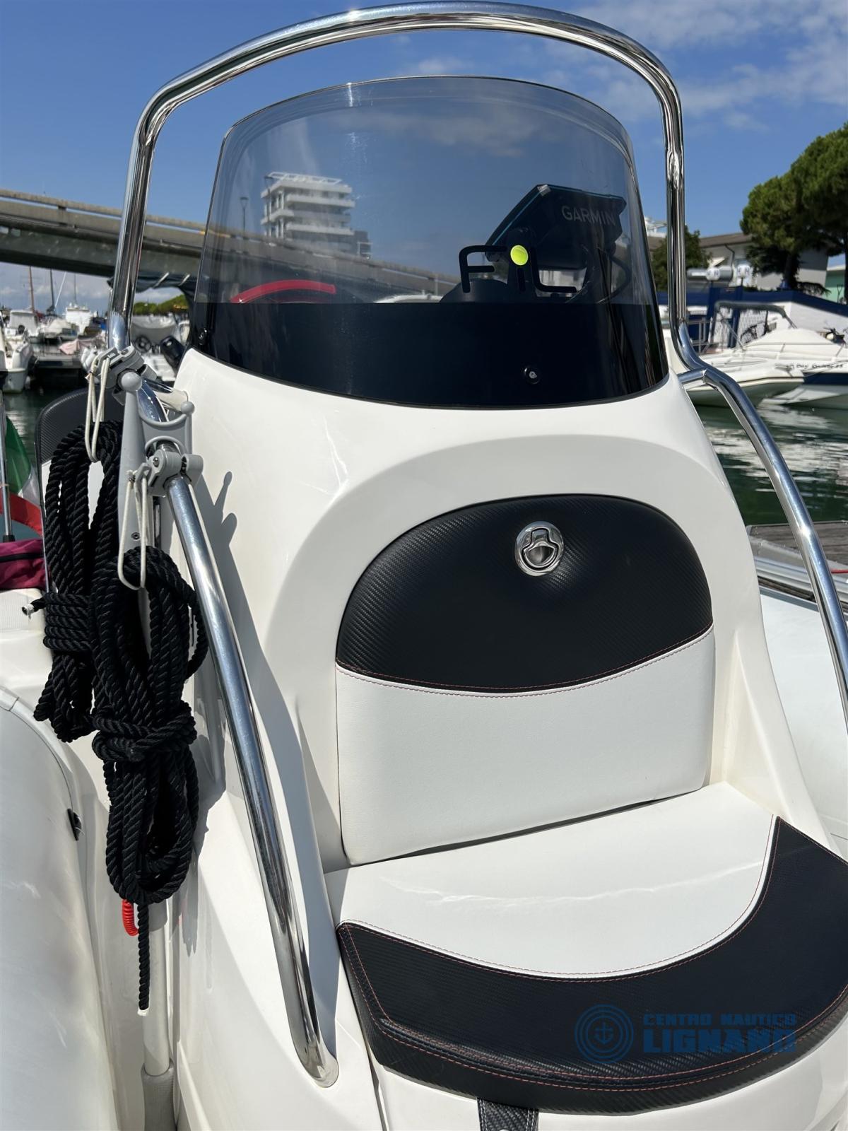 Molte dotazioni comprese tra cui delfiniera di prua, cuscineria a cellula chiusa, pompa di sentina, serbatoio acqua, gonfiatore, scaletta, kit riparazione originale, serbatoio carburante 90 LT, indicatore di livello, doccia a scomparsa a poppa, serie luci di via in console e luce 360 a poppa, tendalino sole, telo copri console, tromba ad incasso, presa usb/presa 12V/contaore, bussola Ritchie, ecoscandaglio Garmin, ancora Hall 6kg con 5mt catena e cima 30mt, sedile fronte console, schienale di poppa ribaltabile, prolunga prendisole di prua, plancette a poppa.