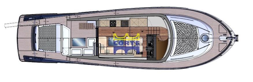 musone di prua inox, protezione inox prua, pulpito in acciaio inox, lift plancetta, T top pozzetto, filtri doppi racor, Blower, joy stick ancoring position, intruder interceptor Volvo, boccaporti fly in dinette apribili, underwater