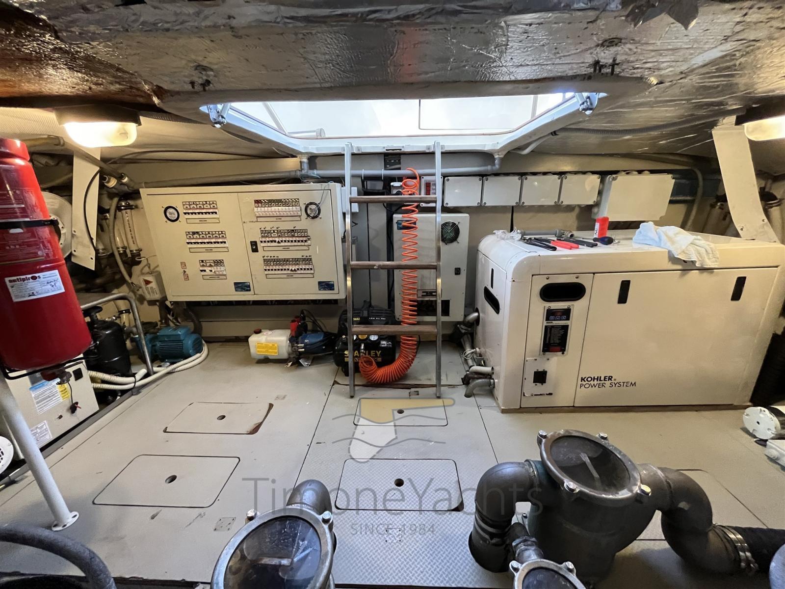 Allarme motore, Ancora (Catena nuova 50 mt), Autoclave, 2 Caricabatterie (Nuovi barca e generatore), Doccia esterna, Doppia timoneria, Faro orientabile, Flap idraulici, Impianto antincendio, Indicatori Flaps, Lavaggio catena, Luci subacquee (2 bianche e 2 blu), Passerella (in teak), Piattaforma (in teak), Pompa di sentina automatica, Pozzetto Teak, Presa 220V banchina, Rollbar, Salpa Ancore Elettrico, Scaletta da bagno, Selle per Tender, Tavolo pozzetto (in teak e acciaio), Tender (SUR 350 30cv con trim idraulico), 2 Winch tonneggio di poppa.