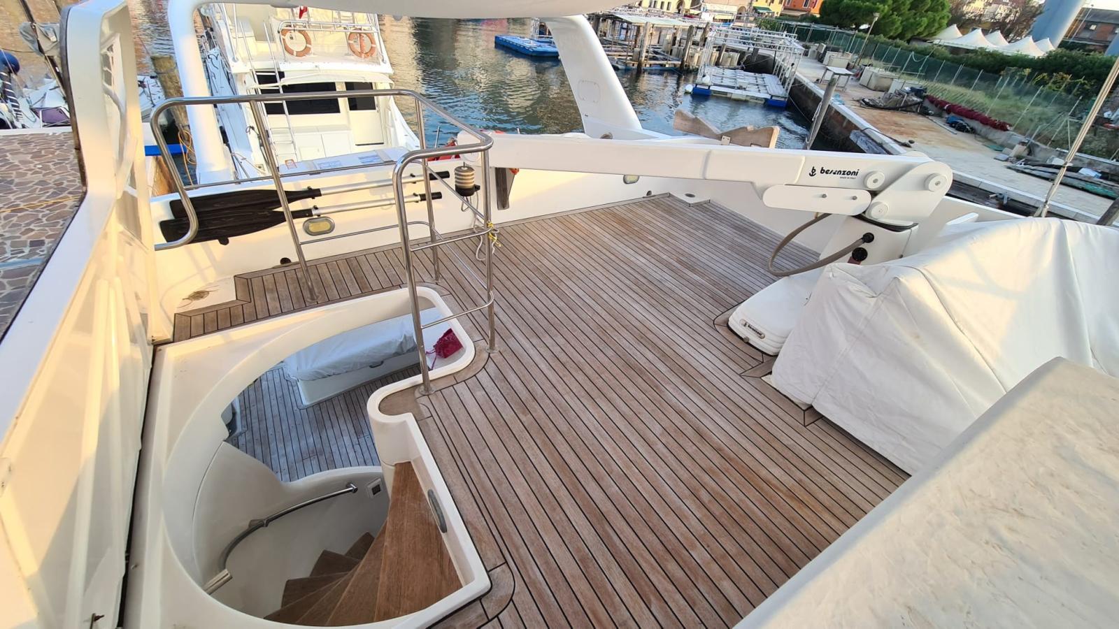 Allarme motore, Allarme sentina, 2 Asse di rispetto, Autoclave, Batterie (2022), Camminamenti laterali in teak, Caricabatterie (2022), Doccia esterna, Elica di poppa - stern thruster (revisionata), Elica di prua - bow thruster (revisionata), Faro orientabile, 2 Flap idraulici, Gruette per tender su fly (Besenzoni), Impianto antincendio, Indicatori Flaps (impianto nuovo 2022), Luci di cortesia, Passerella (idraulica), Piattaforma, Pompa di sentina automatica, Pompa di sentina manuale, Porta ingresso, Pozzetto Teak, Presa 220V banchina, 2 Raddrizzatore (2022), Rollbar (con faretti nuovi), Salpa Ancore Elettrico (revisionato e nuova ancora), Scaletta da bagno, Tavolo pozzetto, Tender, Tromba, 3 Winch.