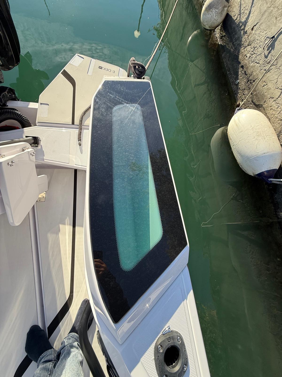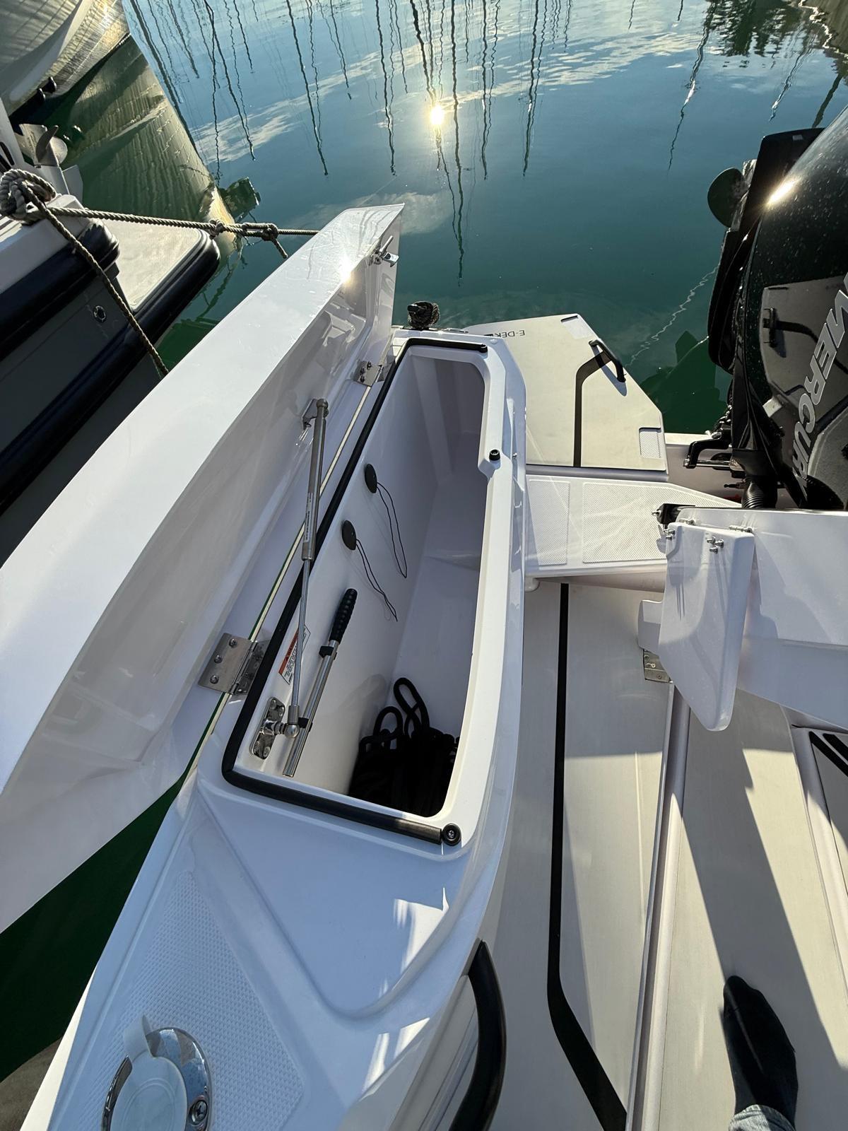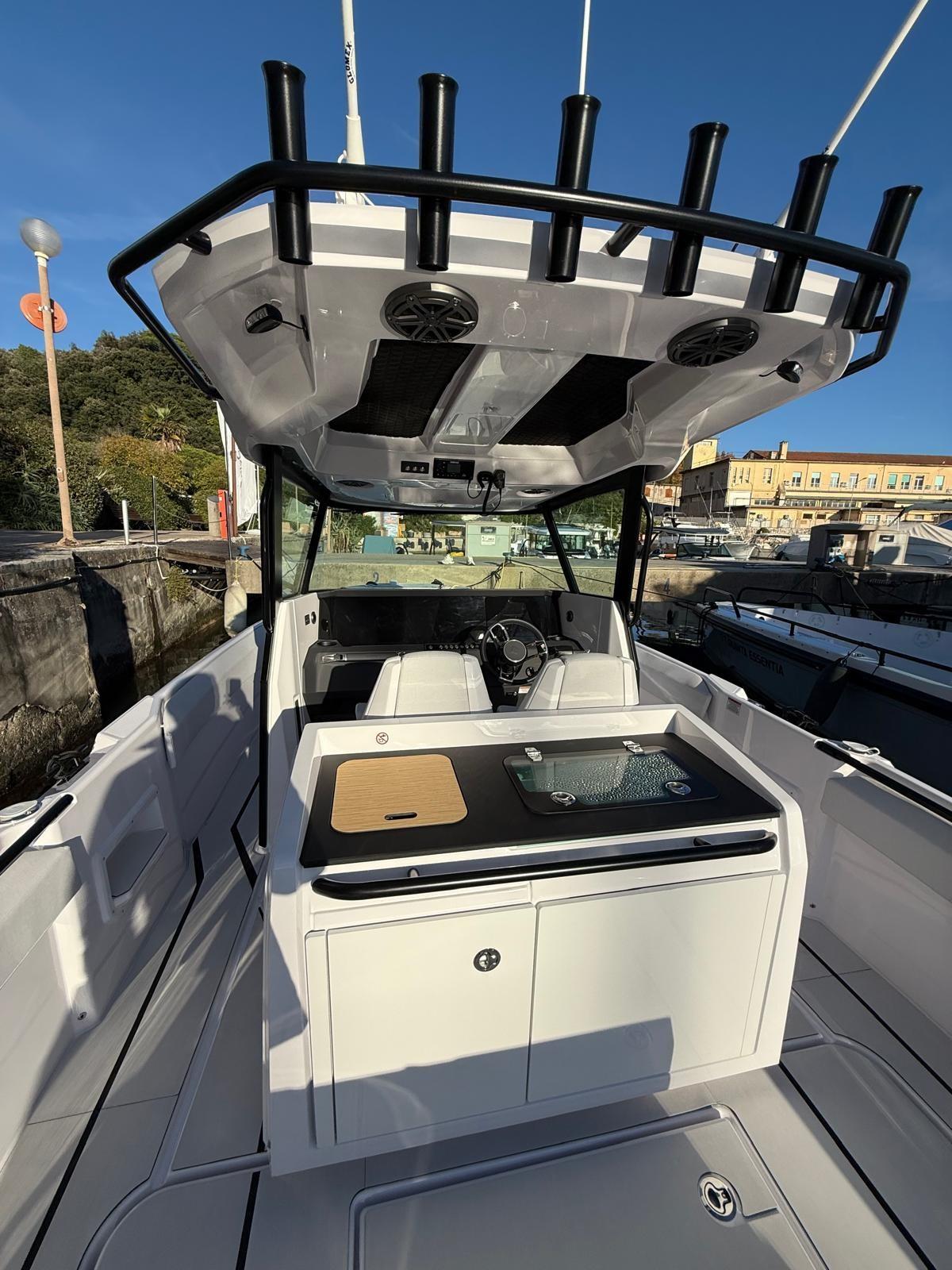 Coppia di motori Mercury 200 hp neri, OPTIONAL DA PESCA COMPLETI, 2 Vasche del vivo, vasca del pescato con maceratore, portacanne modulo da pesca con cassetto porta esche, luci da lavoro, panca pieghevole a poppa, audio premium JL Audio, elettronica Simrad: NSX 12 pollici, trasduttore passante high-wide chirp, Vhf.