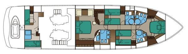Imbarcazione dotata di n. 4 cabine ognuna dotata di bagno (cabine master e VIP matrimoniali, n. 2 cabine ospiti dotate di n. 2 letti singoli), n. 2 cabine crew .