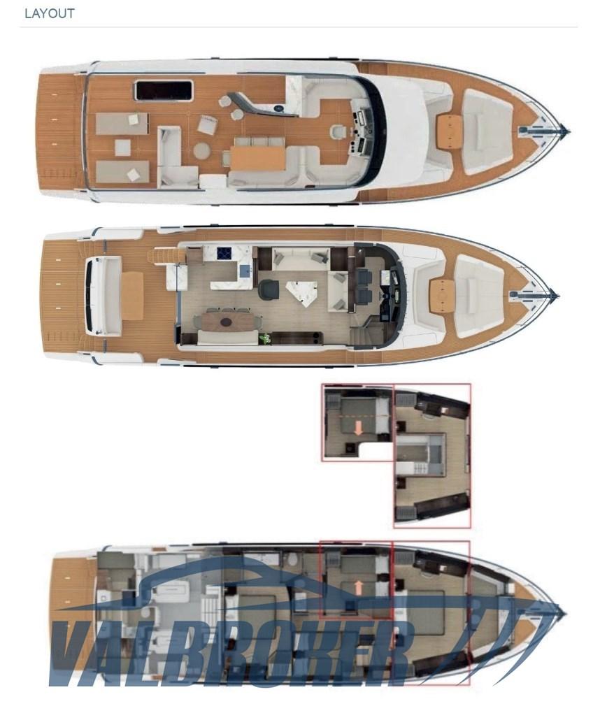 tenda ombreggiante divano e prendisole prua con pali in carbonio, kit coperture complete, tavolo a prua in teak con gamba elettrica, copertura e schienale per prendisole, teli chiusura fly, tenda ombreggiante a poppa con pali in carbonio,Avvolgitori cavi banchina, serbatoio acque grigie, veneziane elettriche, interni in Luxury