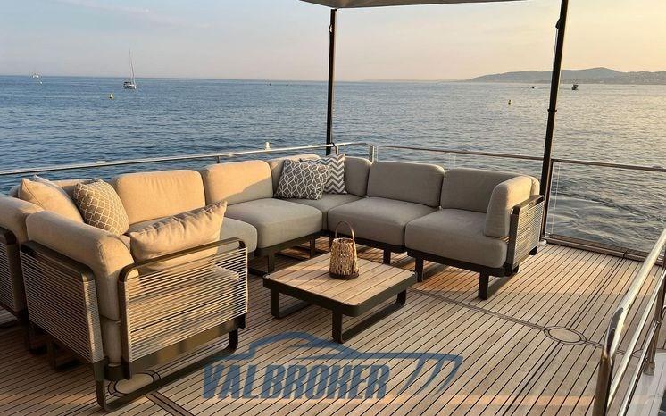 Ancora (inox ultra con catena80kg), Autoclave, Camminamenti laterali in teak, Doccia esterna, Faro orientabile (doppio comando), Hard top (soft top vetroresina bianco), Luci di cortesia, Luci subacquee, Passerella (elettroidraulica a scomparsa, teak), Piattaforma (teak, idraulica), Pozzetto Teak, Presa 220V banchina, Scaletta da bagno (integrata alla piattaforma), Tavolo pozzetto (con copertura).