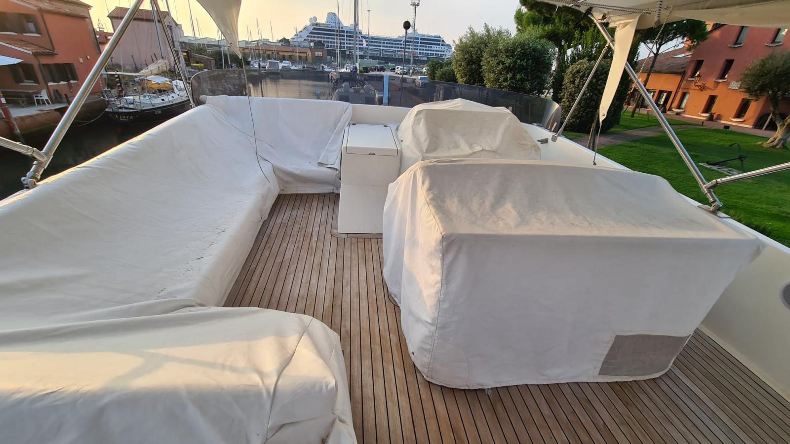 Allarme motore, Allarme sentina, 2 Asse di rispetto, Autoclave, Batterie (2022), Camminamenti laterali in teak, Caricabatterie (2022), Doccia esterna, Elica di poppa - stern thruster (revisionata), Elica di prua - bow thruster (revisionata), Faro orientabile, 2 Flap idraulici, Gruette per tender su fly (Besenzoni), Impianto antincendio, Indicatori Flaps (impianto nuovo 2022), Luci di cortesia, Passerella (idraulica), Piattaforma, Pompa di sentina automatica, Pompa di sentina manuale, Porta ingresso, Pozzetto Teak, Presa 220V banchina, 2 Raddrizzatore (2022), Rollbar (con faretti nuovi), Salpa Ancore Elettrico (revisionato e nuova ancora), Scaletta da bagno, Tavolo pozzetto, Tender, Tromba, 3 Winch.