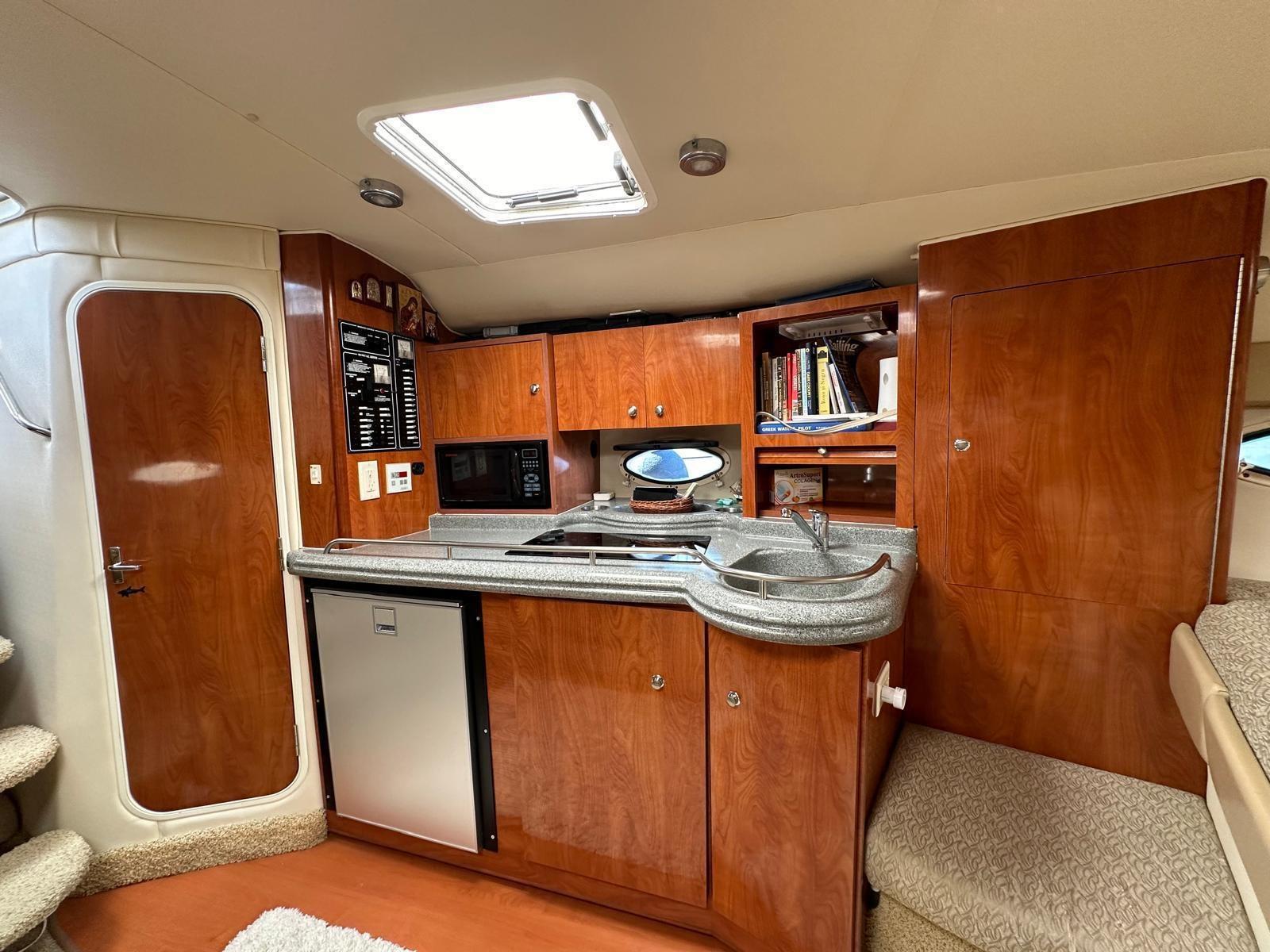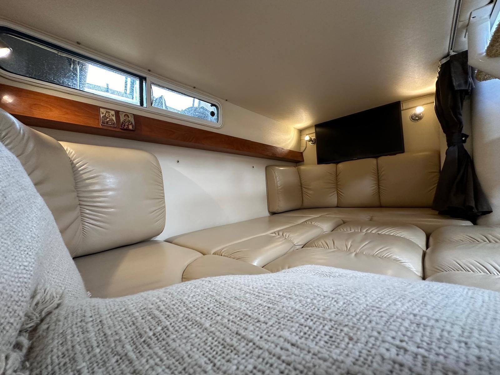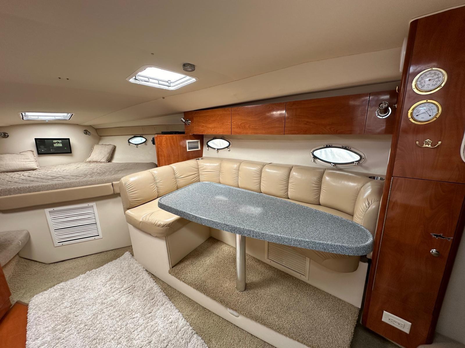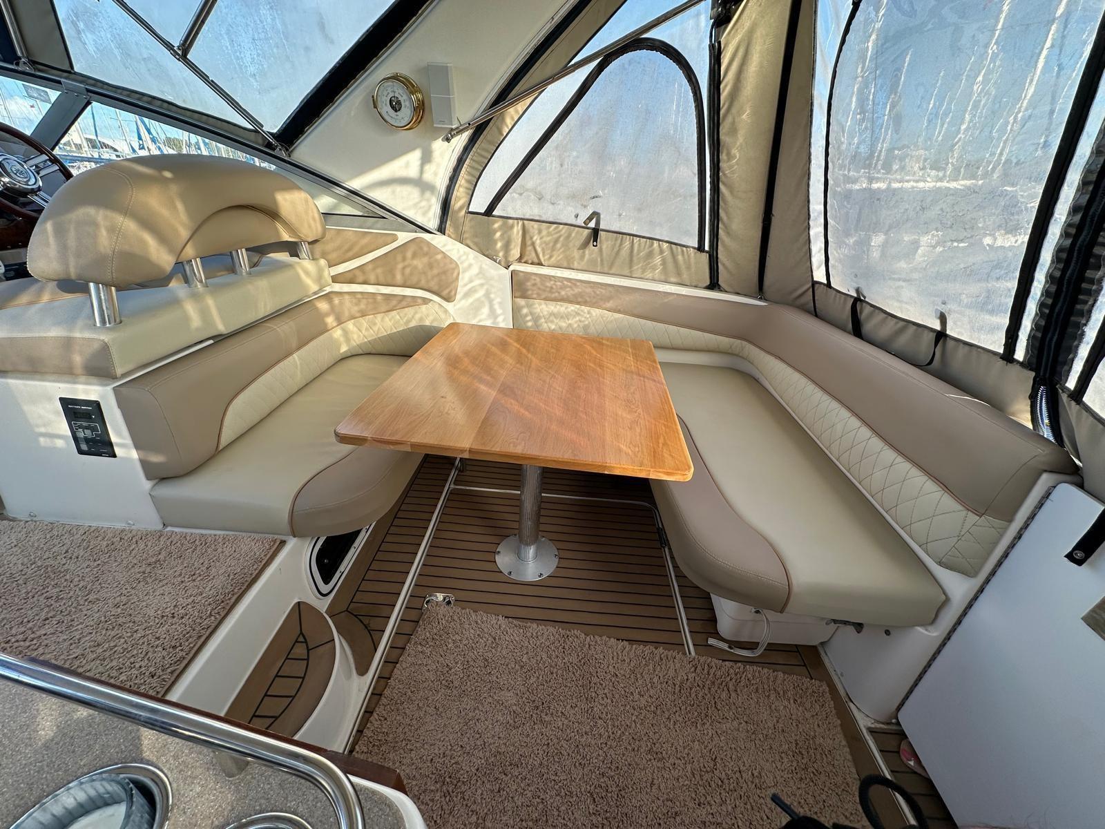 It features a dinette that converts into a V-berth (bow berth), a spacious aft cabin (mid-cabin) and an additional sofa, offering various configurations for overnight stays. The galley is fully equipped with ample storage, a fridge, microwave, two-burner hob and coffee machine, making it ideal for medium-range cruising. A convivial design is tailored for socialising, with plenty of seating and comfortable backrests. Integrated wet bar: the inclusion of a sink, an icebox and an external bar unit facilitates outdoor entertaining. The design allows safe and easy access to the forward sun deck via the opening windscreen. Fitted with twin 2017 Volvo Penta D3 engines, the boat can reach top speeds of around 35 knots, a remarkable performance for a cruiser of this size. The hull is designed to maintain good seakeeping, ensuring a dry and safe ride even in less than ideal conditions. The engine compartment is spacious and equipped with an electric lift, greatly simplifying maintenance work.
