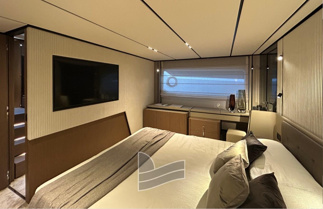 Master cabin a tutto baglio: uno spazio ampio, luminoso e silenzioso, posizionato al centro dello scafo per massimizzare stabilità e comfort. Il bagno en suite e le finiture ricercate contribuiscono a creare un ambiente intimo e sofisticato.