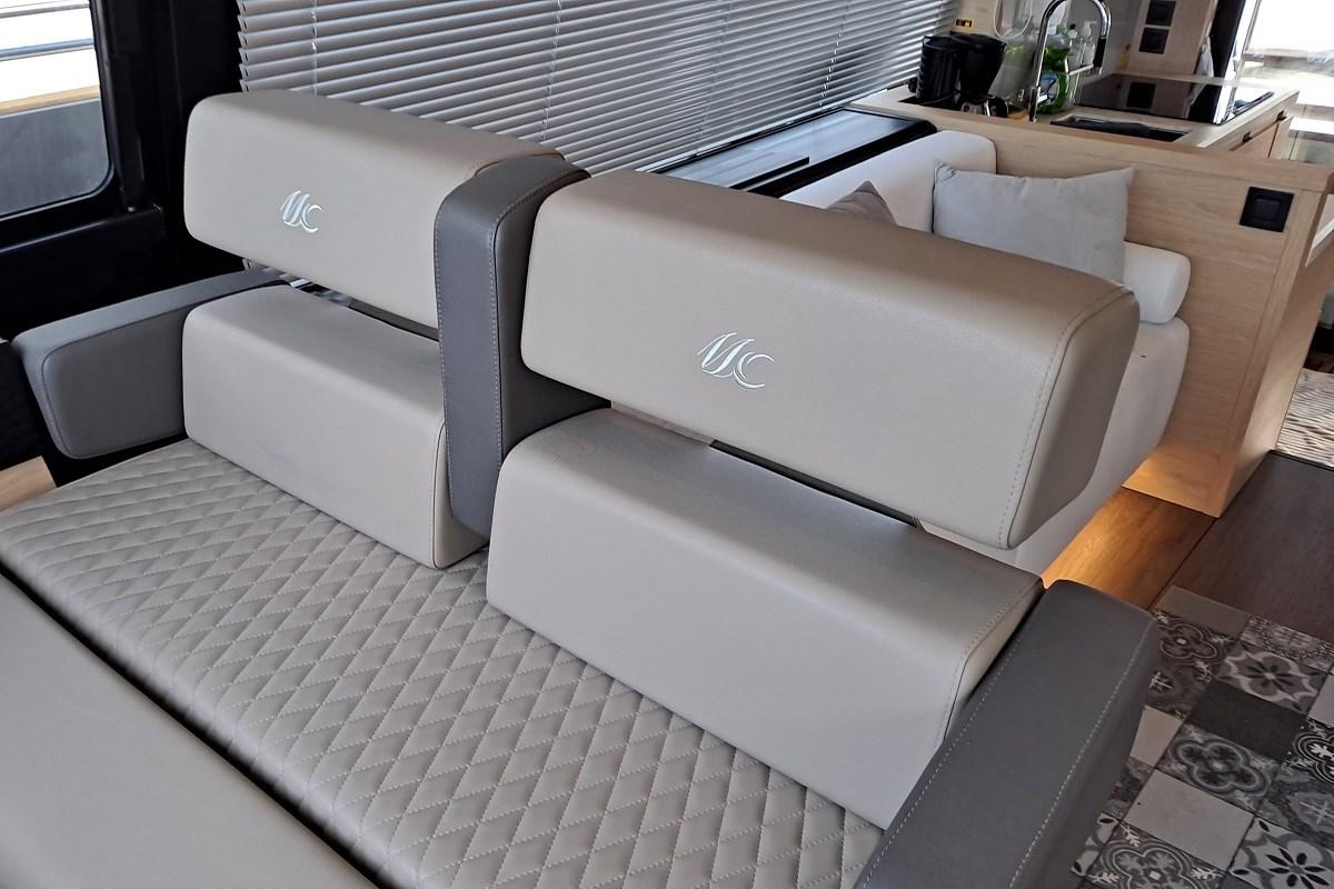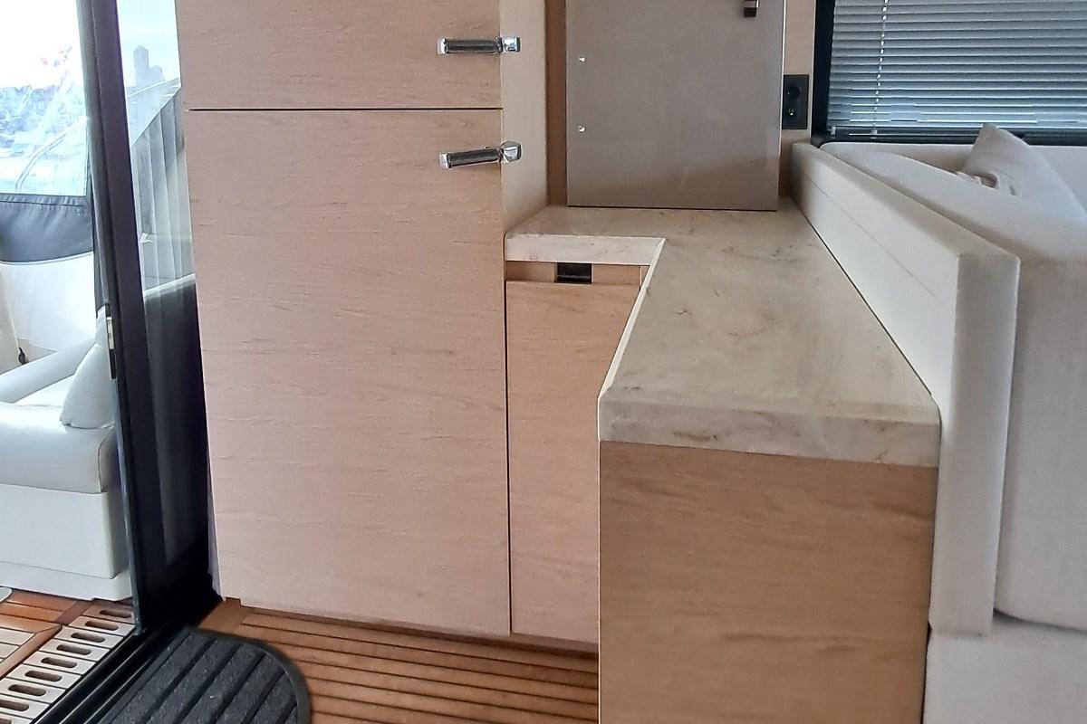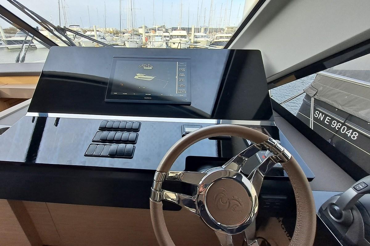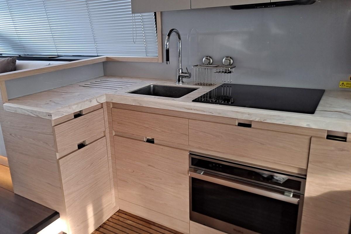 Ponte Principale con cucina posizionata strategicamente tra il pozzetto e il salone. Aprendo la vetrata, si crea un'unica area conviviale. È dotata di piano cottura in vetroceramica, forno, frigo con congelatore a colonna e ampi spazi di stivaggio. Verso prua si trova l'area living con un grande divano a "U" e un tavolo da pranzo. Le enormi vetrate laterali offrono una vista a 360° e molta luce naturale. Plancia di comando situata a dritta, integra il sistema Ship Control con i display Garmin per la gestione totale della barca.