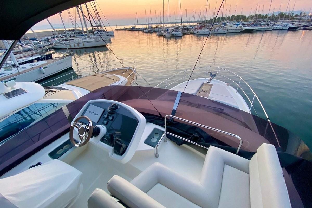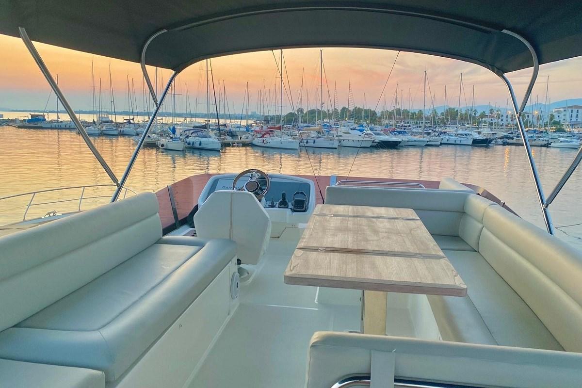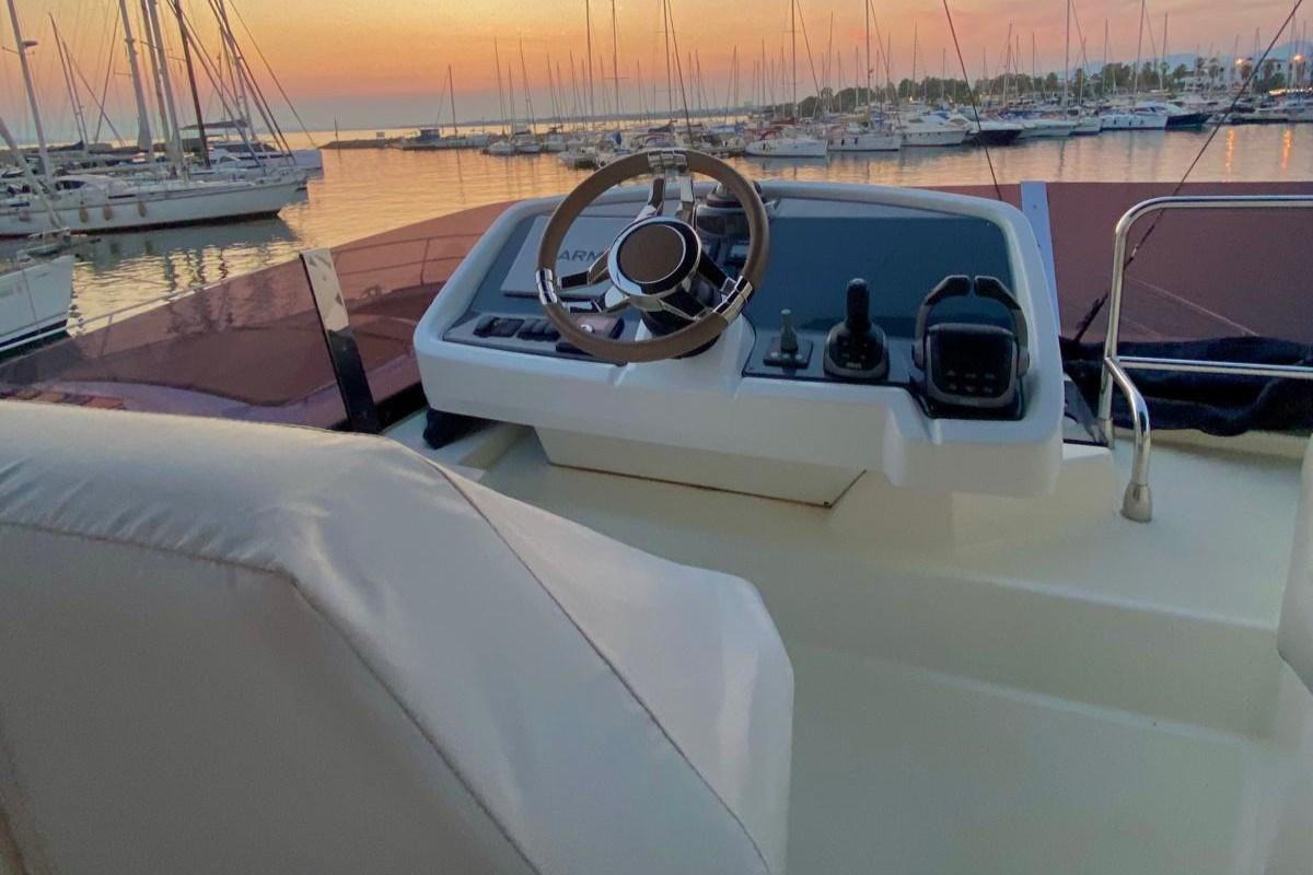 Flybridge, tra i più spaziosi della categoria, con timoneria situata a prua sulla sinistra, con strumentazione completa collegata allo Ship Control. Zona Lounge con grande divano a "U" a poppa con tavolo in teak che può ospitare fino a 8 persone. Mobile bar attrezzato con grill elettrico, lavandino e frigorifero. Prendisole con ampia cuscineria a fianco della timoneria