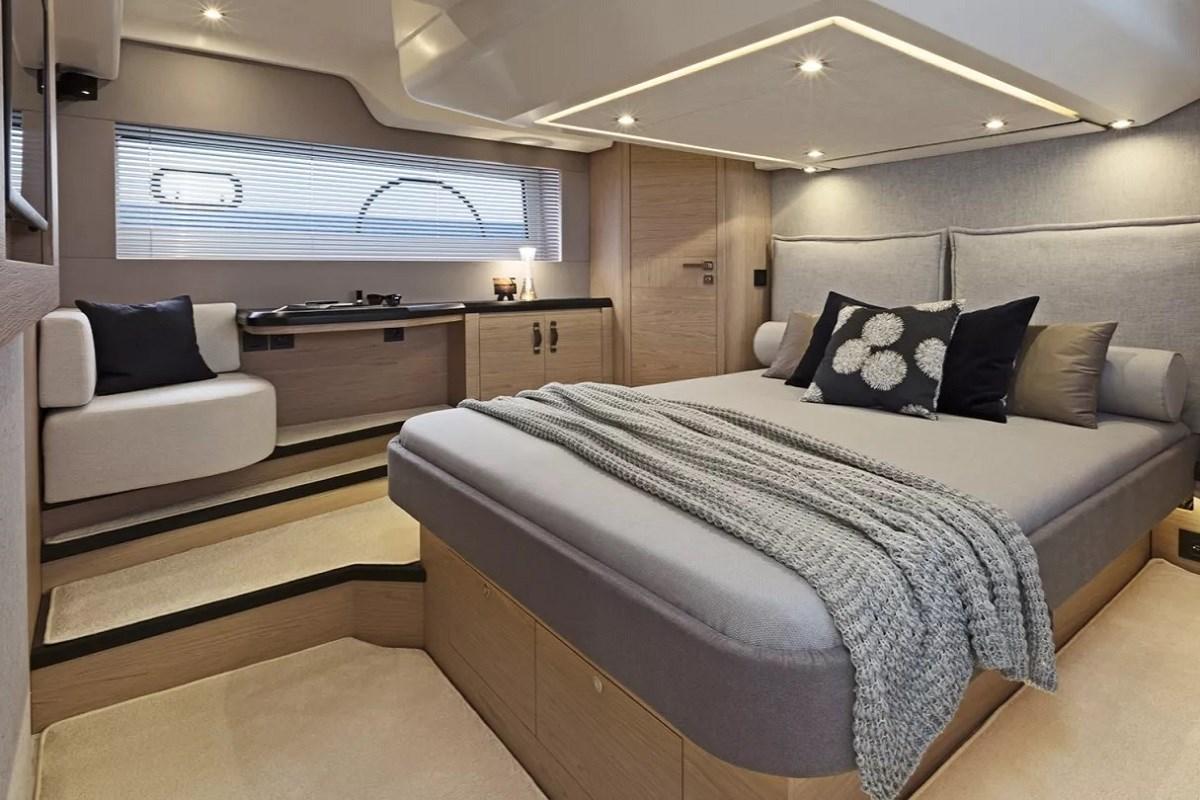 Ponte Inferiore con cabina armatoriale a mezza nave a tutto baglio con letto matrimoniale ad isola, grandi finestrature a scafo, una zona ufficio/trucco e un bagno privato con doccia separata. Cabina VIP a prua, molto luminosa, con letto matrimoniale (trasformabile in due singoli a "V") e accesso diretto al secondo bagno. Cabina Ospiti a dritta dotata di due letti singoli affiancati. Secondo Bagno posizionato a sinistra, funge da bagno per la cabina VIP e per la cabina ospiti (bagno diurno)