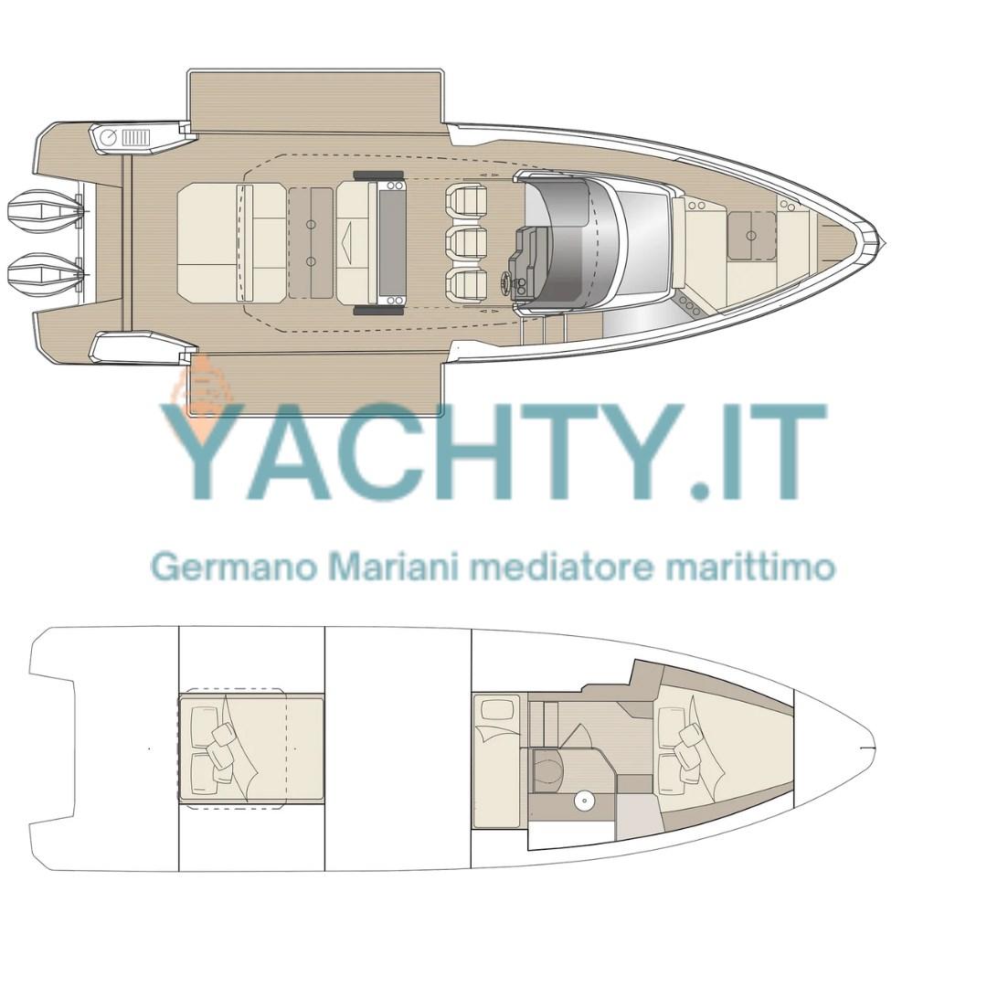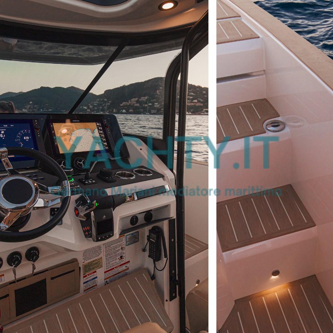 Spinta da 2 x Mercury V10 350 hp Black, garantisce accelerazioni pronte e una conduzione precisa, supportata da una strumentazione di ultima generazione con display Simrad NSS4 da 16”, GPS, ecoscandaglio e VHF. Il cockpit è una vera lounge sull’acqua, valorizzata da pozzetto in teak, tavoli abbattibili (salone con gamba elettrica), luci di cortesia oltre a luci subacquee che trasformano l’ormeggio serale in un momento scenografico.