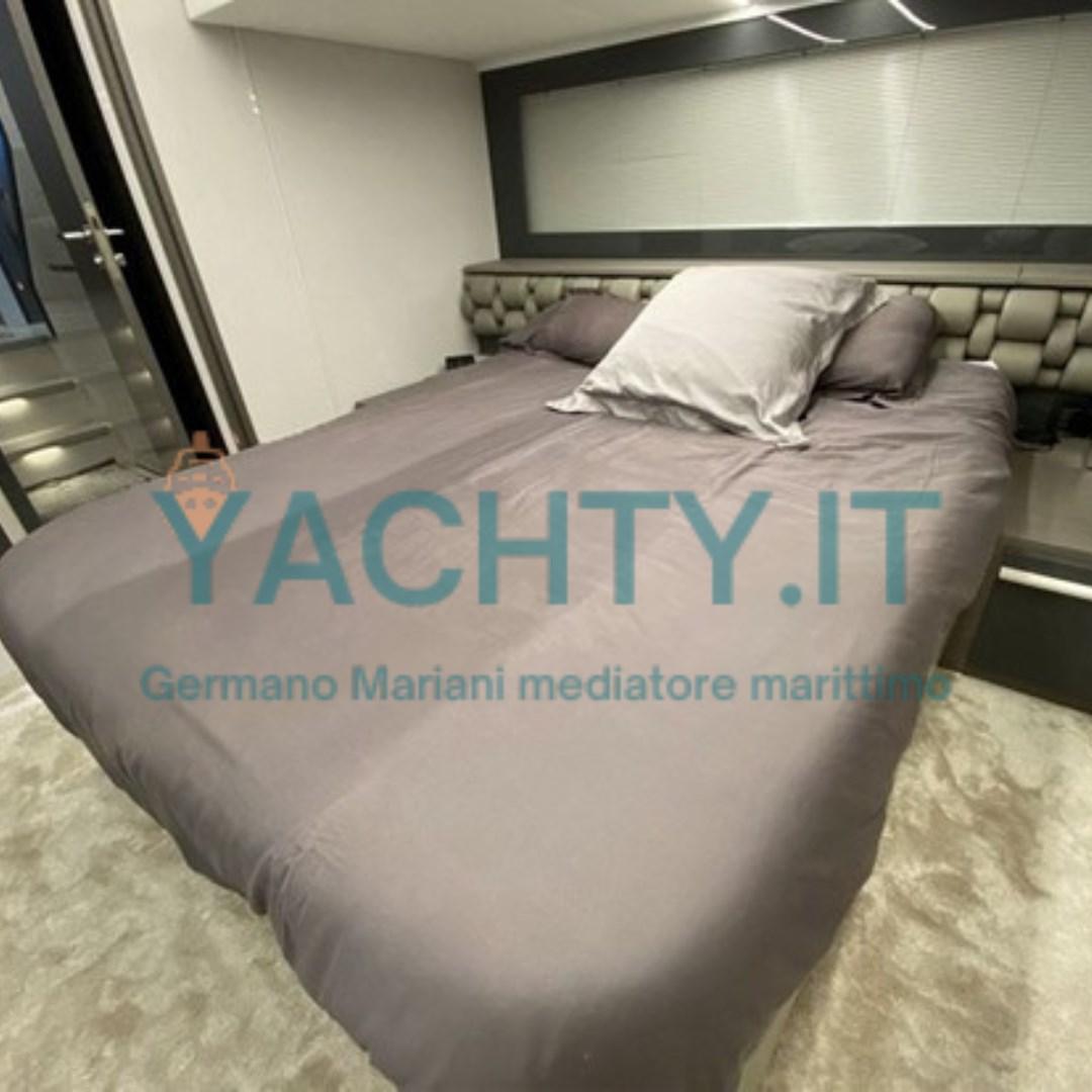 Dotazioni full optional di altissimo livello includono stabilizzatore giroscopico Seakeeper, passerella idraulica a scomparsa, plancetta bagno idraulica, teak completo su tutto il calpestio esterno ed elettronica di bordo Garmin completa di radar e autopilota.