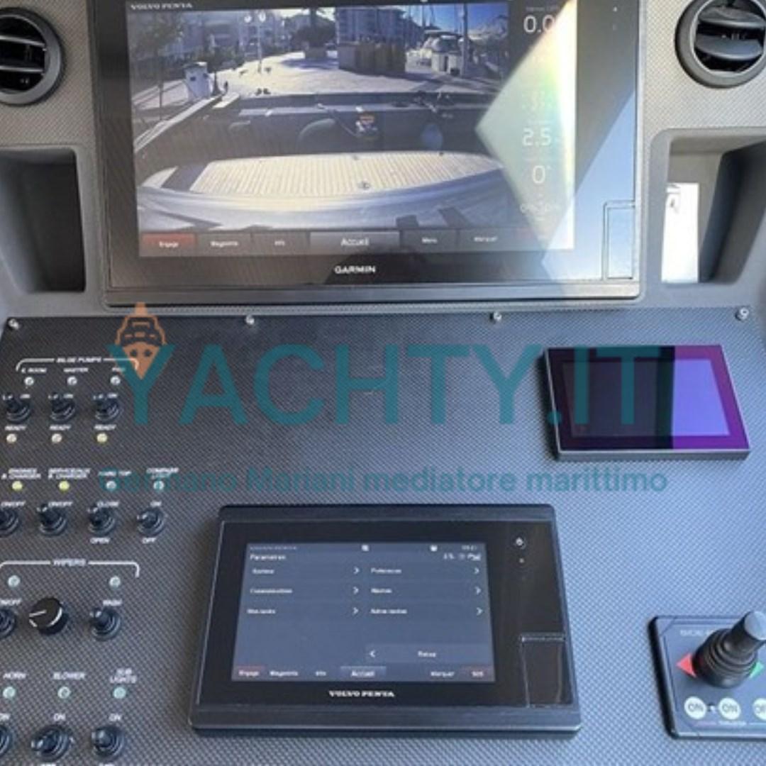 Spinto da una performante motorizzazione 2 x Volvo Penta D11 IPS950 da 725 hp, con sole 360 ore di moto, offre prestazioni brillanti, grande manovrabilità e massima efficienza in navigazione.