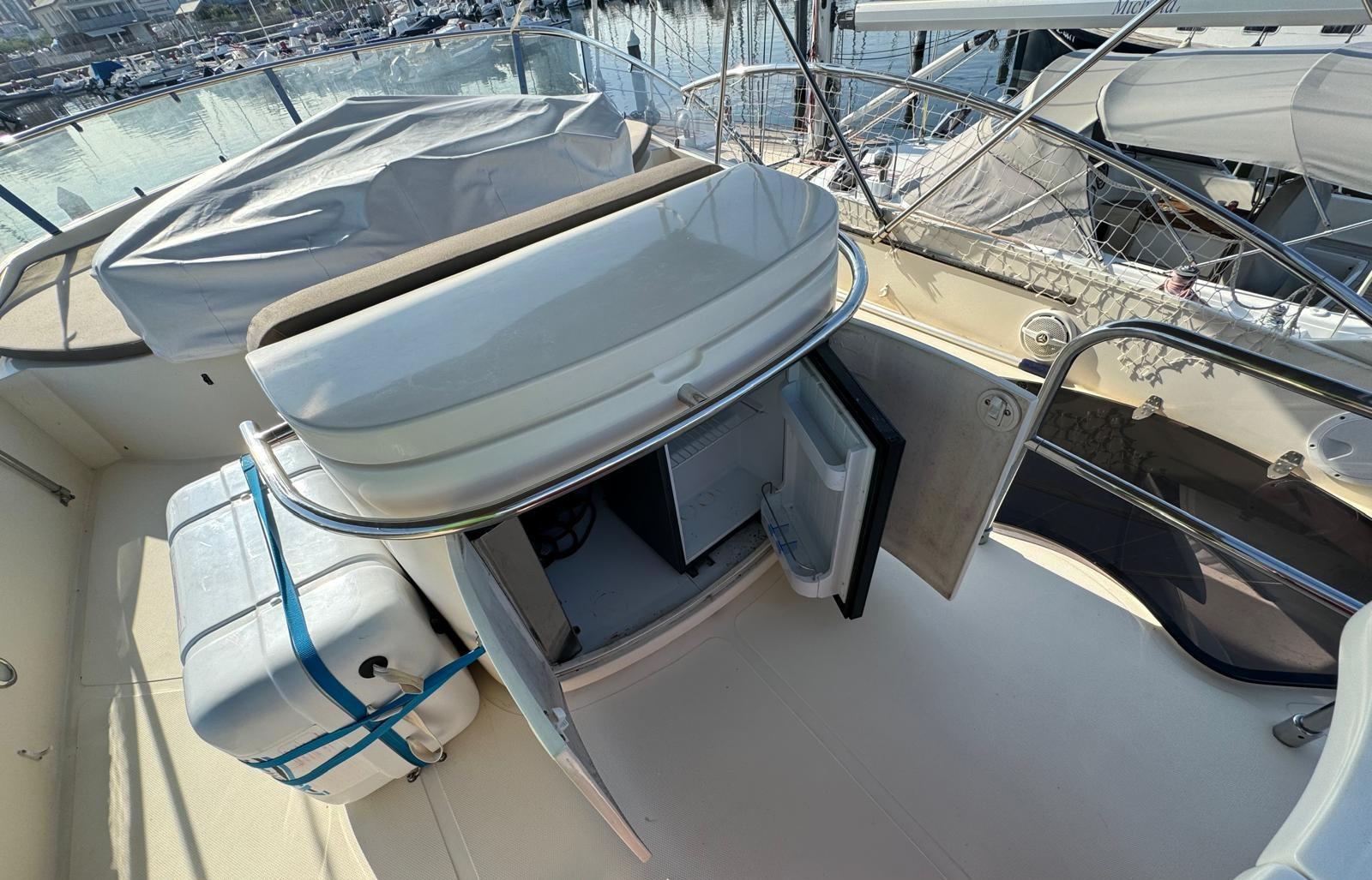 Allarme motore, Autoclave, Doccia esterna, Doppia timoneria, Faro orientabile, Flap elettrici, Impianto antincendio, Lavandino nel Pozzetto, Luci di cortesia, Passerella, Piattaforma, Pompa di sentina automatica, Pompa di sentina manuale, Porta ingresso, Pozzetto Teak, Presa 220V banchina, Ripetitore strumentazione, Rollbar, Salpa Ancore Elettrico, Scaletta da bagno, Tavolo pozzetto, Tientibene con cancelletti, Tromba, Winch tonneggio di poppa.