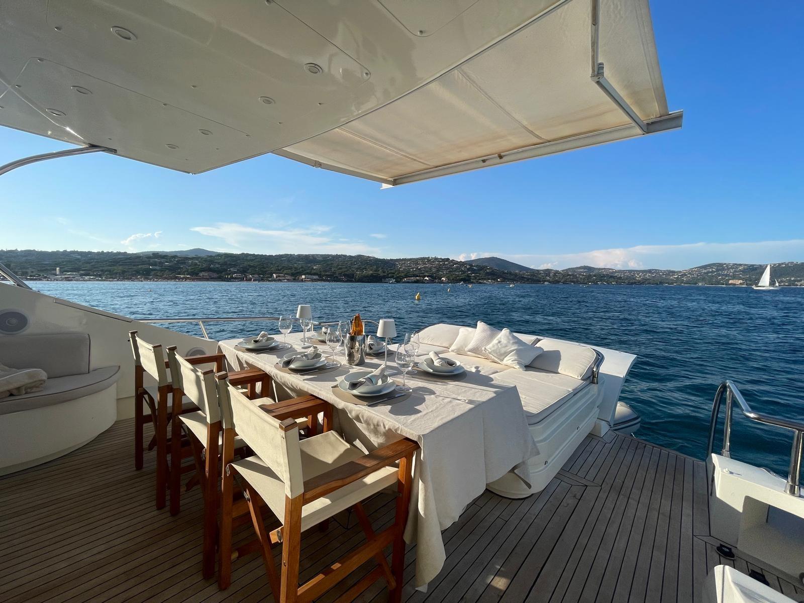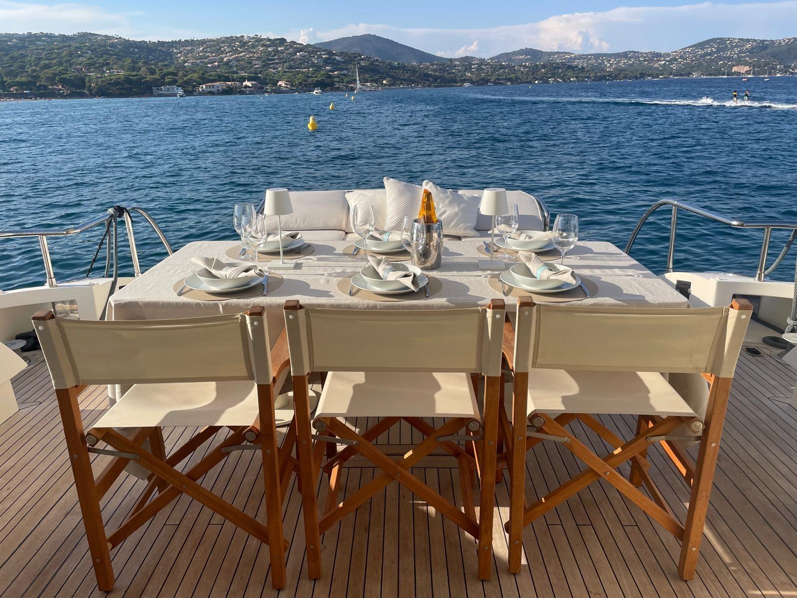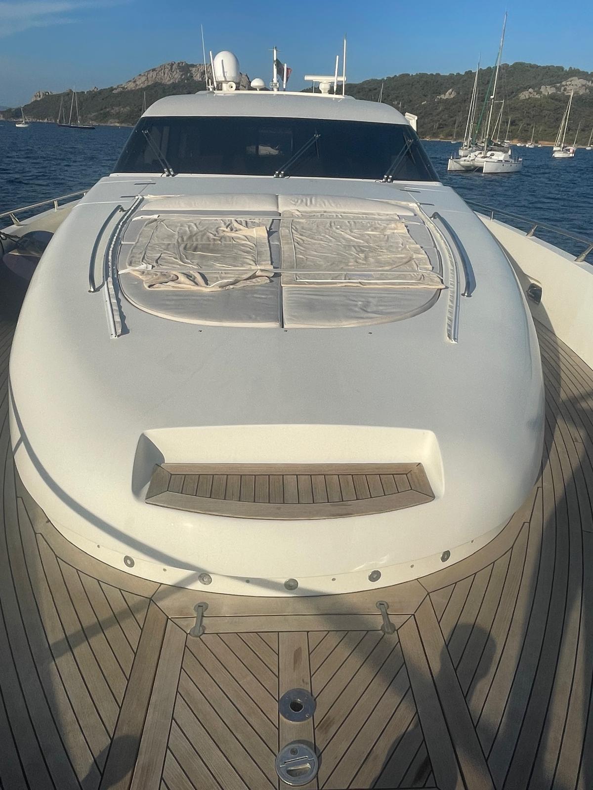 Allarme motore, Allarme sentina, Autoclave, Camminamenti laterali in teak, Doccia esterna, Faro orientabile, Flap idraulici, Garage per tender, Hard top, Impianto antincendio, Indicatori Flaps, Lavaggio catena, Luci di cortesia, Luci subacquee, Passerella, Piattaforma, Pompa di sentina automatica, Pompa di sentina manuale, Porta ingresso, Porta laterale, Pozzetto Teak, Presa 220V banchina, Presa acqua banchina, Rollbar, Salpa Ancore Elettrico, Scaletta da bagno, Tavolo pozzetto, Tientibene con cancelletti, Tromba, 2 Winch tonneggio di poppa.