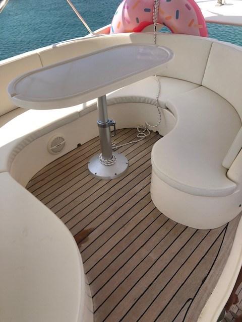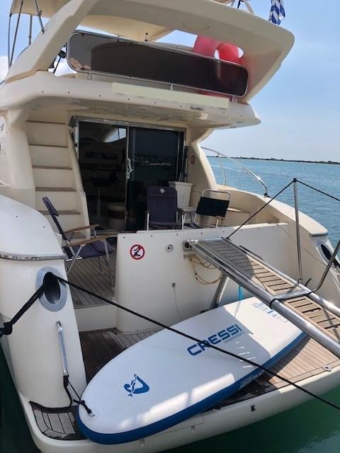 Allarme motore, Allarme sentina, Autoclave, Camminamenti laterali in teak, Doccia esterna, Doppia timoneria, Faro orientabile, Flap elettrici, Luci di cortesia, Pompa di sentina automatica, Porta ingresso, Pozzetto Teak, Presa 220V banchina, Rollbar, Salpa Ancore Elettrico, Scaletta da bagno, Tromba, Tuga in teak.