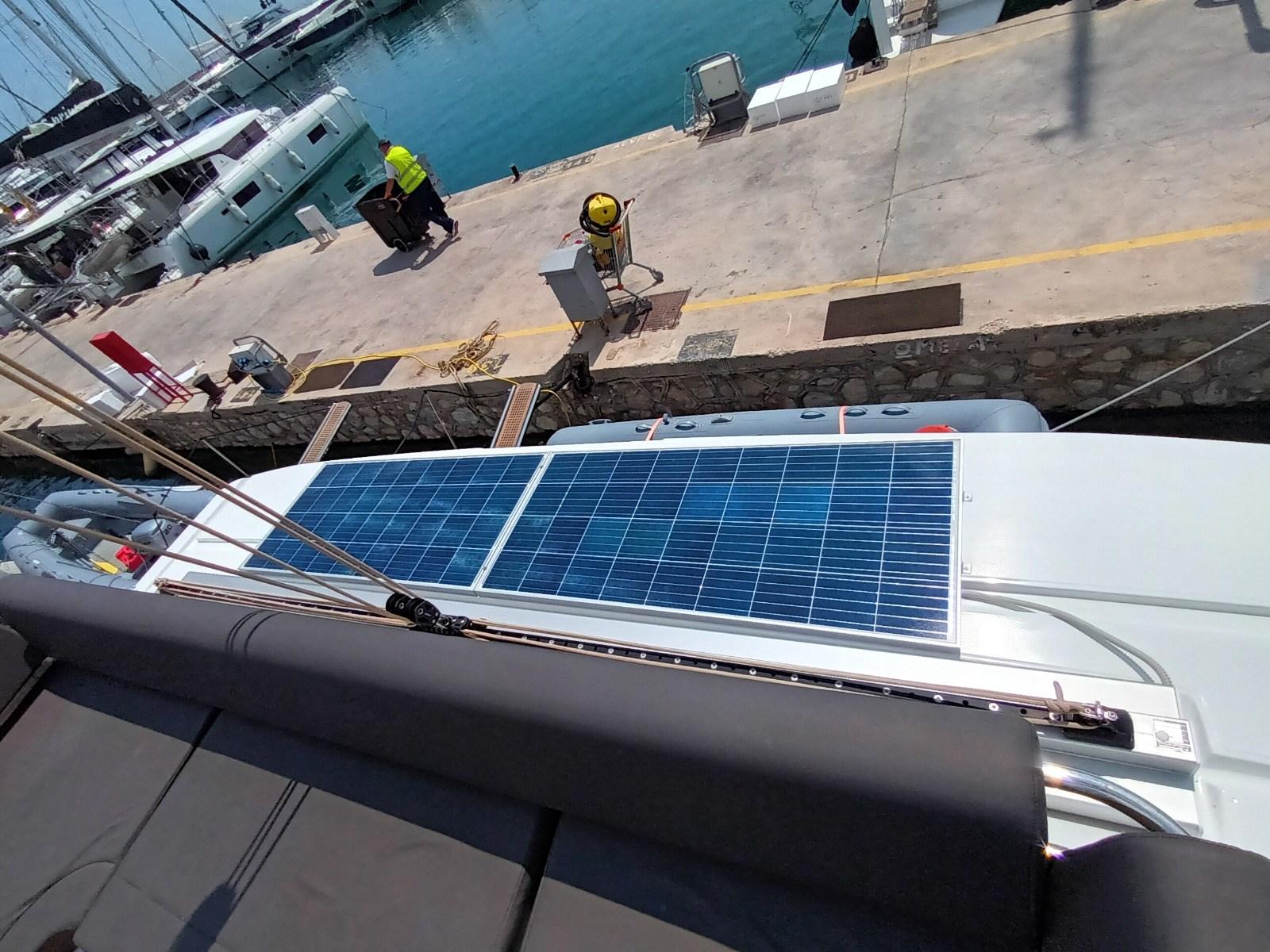 Allarme motore, Allarme sentina, Alternatore, 2 Ancora (32 kg con 82 m di catena + ancora con 20 m di catena), Autoclave, Doccia esterna, Motore fuoribordo per tender (HONDA 6hp), 2 Pannelli Solari (150W), Passerella (idraulica 3 m), Piattaforma, Pompa di sentina automatica, Porta ingresso, Pozzetto Teak, Presa 220V banchina, Presa acqua banchina, Salpa Ancore Elettrico, Sartiame spiroidale, Scaletta da bagno, Tavolo pozzetto, Tender (3.60 m), Windex.