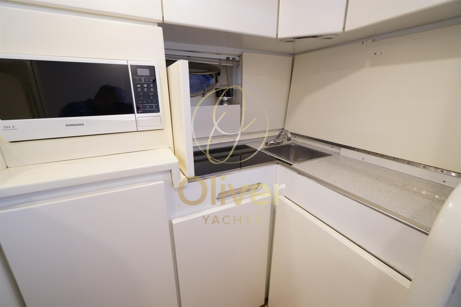 La cucina, completamente attrezzata e integrata, è progettata per un utilizzo reale in crociera, offrendo praticità senza compromettere lo spazio abitativo.