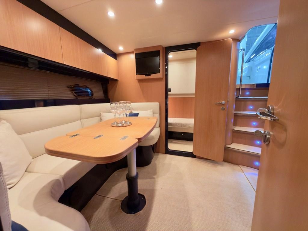 Gli interni, luminosi e ariosi, offrono una cabina armatoriale a prua con bagno indipendente, un salone con cucina e una cabina ospiti particolarmente ampia e confortevole, data la sua collocazione a centro barca.