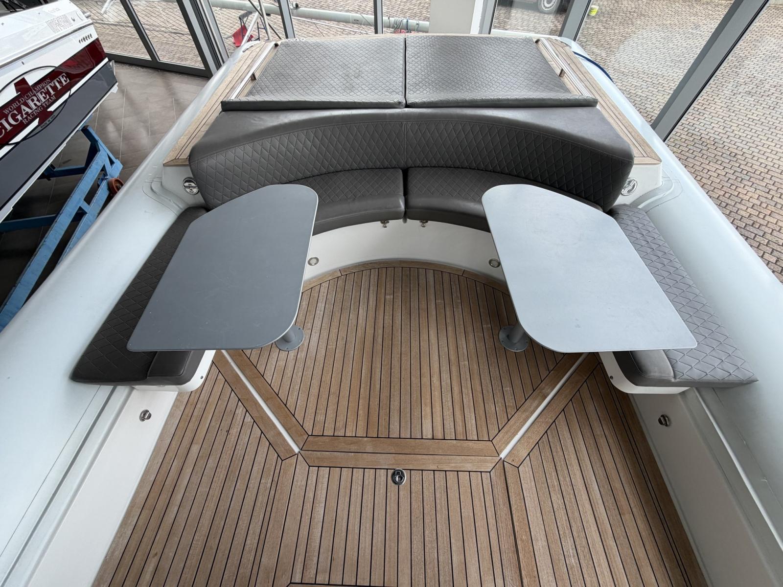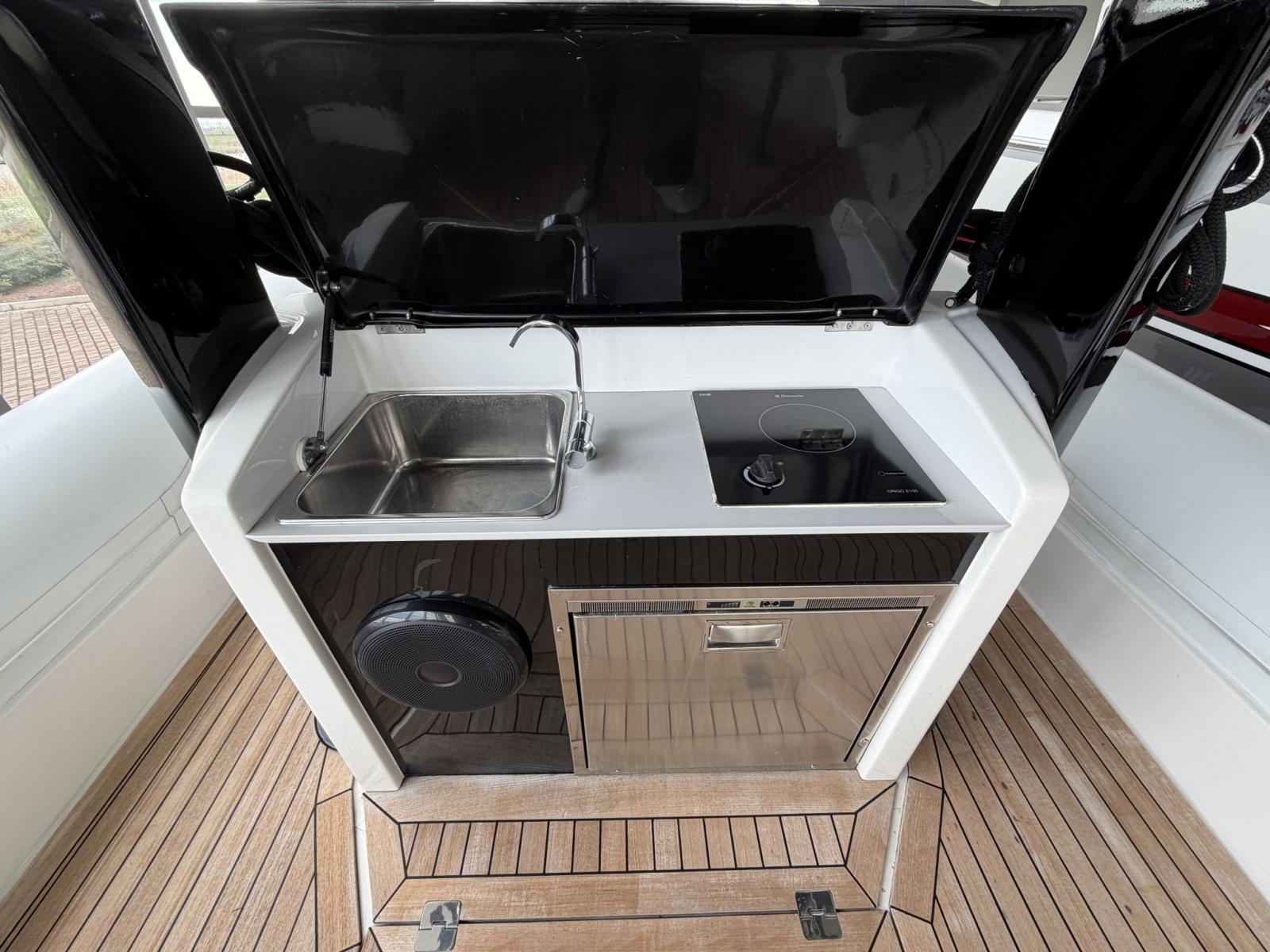 Allarme fumo/gas, Allarme motore, Allarme sentina, Apertura Vano Motore Elettrica, Camminamenti laterali in teak, Cavo corrente di banchina, Doccia esterna, Luci subacquee, Monitor batteria, Pompa di sentina automatica, Pompa di sentina manuale, Ponte in teak, Pozzetto Teak, Presa 220V banchina, Salpa Ancore Elettrico, Tavolo pozzetto, Tromba.