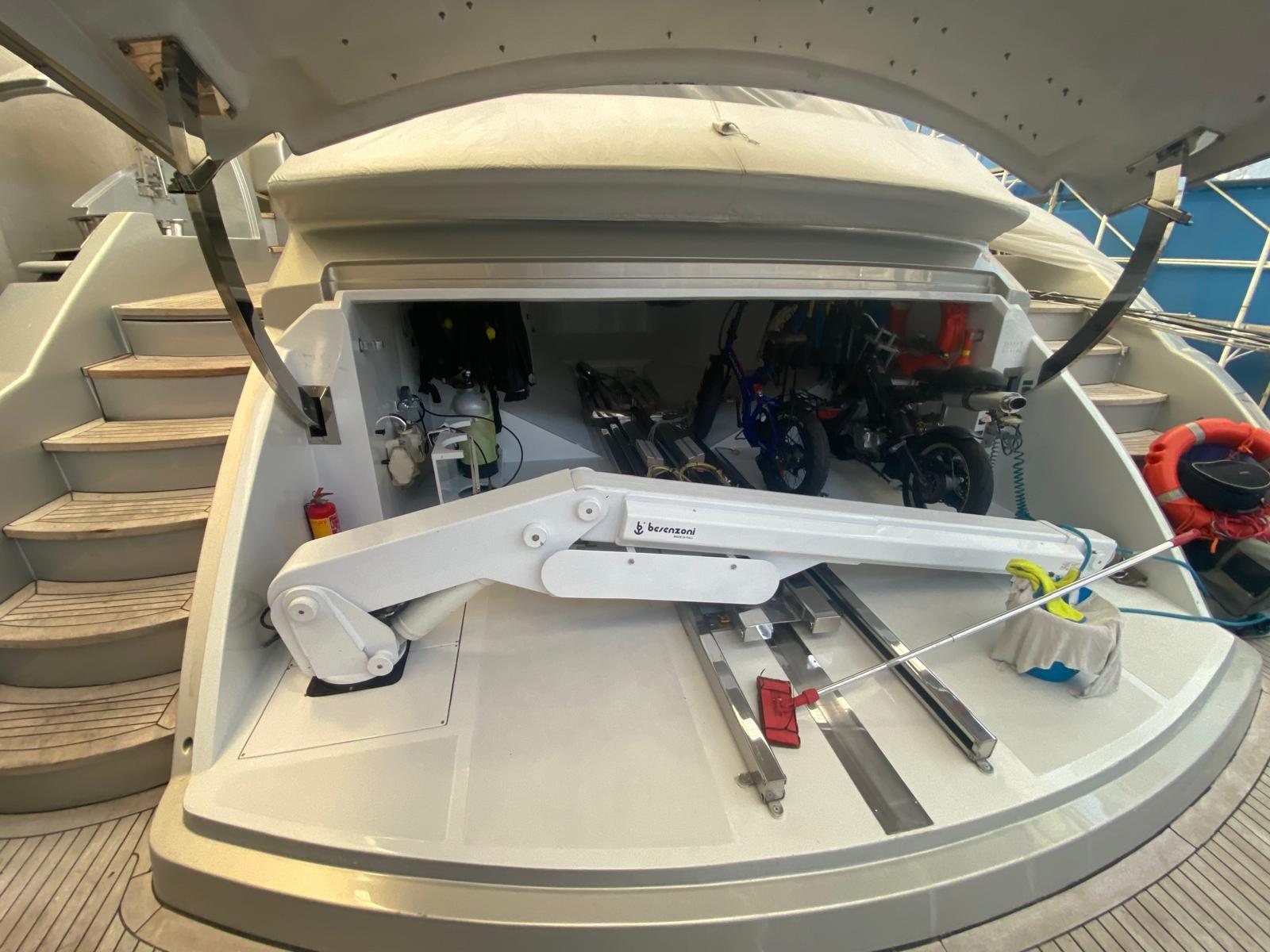 Allarme motore, Allarme sentina, Alternatore, Autoclave, Bitte Abbattibili, Camminamenti laterali in teak, Cavo corrente di banchina, Colorazione speciale, Doccia esterna, Fari fissi a poppa, Faro orientabile, Garage per tender, Gruette per tender, Hard top, Impianto antincendio, Lavaggio catena, Lavandino nel Pozzetto, Luci di cortesia, Luci subacquee, Monitor batteria, Parabordi, Piattaforma, Pompa di Scarico del Serbatoio Acque Reflue, Pompa di sentina automatica, Pompa di sentina manuale, Ponte in teak, Porta ingresso, Porta laterale, Pozzetto Teak, Presa 220V banchina, Presa acqua banchina, Salpa Ancore Idraulico, Scala reale, Scaletta da bagno, Sistema Depurazione acque nere, Tavolo pozzetto, Tromba, Winch Idraulico, Winch tonneggio di poppa, Winch tonneggio di prua.