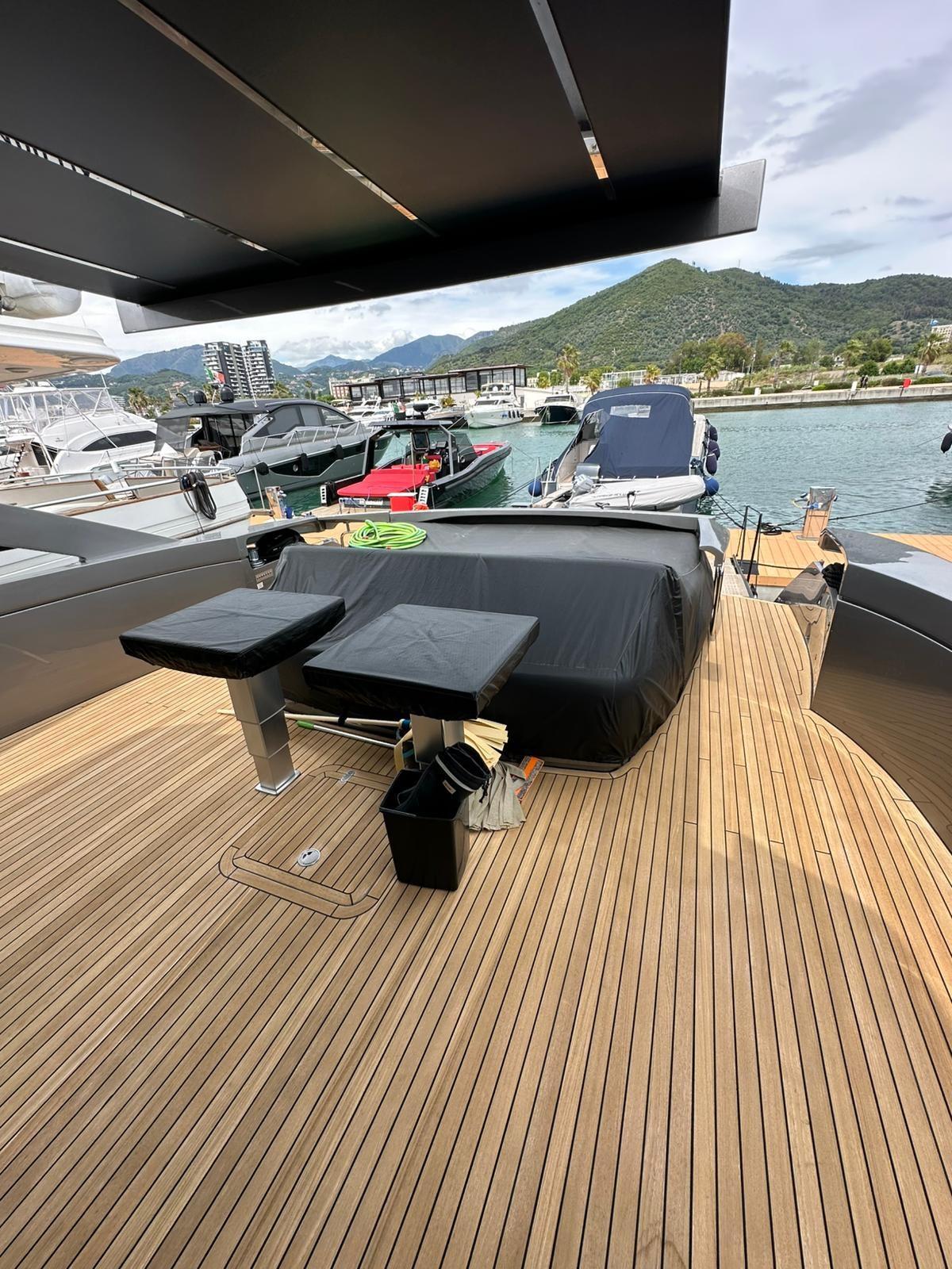 Allarme motore, Allarme sentina, Alternatore, Autoclave, Bitte Abbattibili, Camminamenti laterali in teak, Doccia esterna, Faro orientabile, Flap idraulici, Garage per tender, Hard top, Impianto antincendio, Indicatori Flaps, Lavaggio catena, Lavandino nel Pozzetto, Luci di cortesia, Luci subacquee, Passerella, Piattaforma, Pompa di sentina automatica, Pompa di sentina manuale, Ponte in teak, Porta ingresso, Pozzetto Teak, Presa 220V banchina, Salpa Ancore Elettrico, Scaletta da bagno, Stabilizzatori, Tavolo pozzetto, Tromba, 2 Winch tonneggio di poppa.