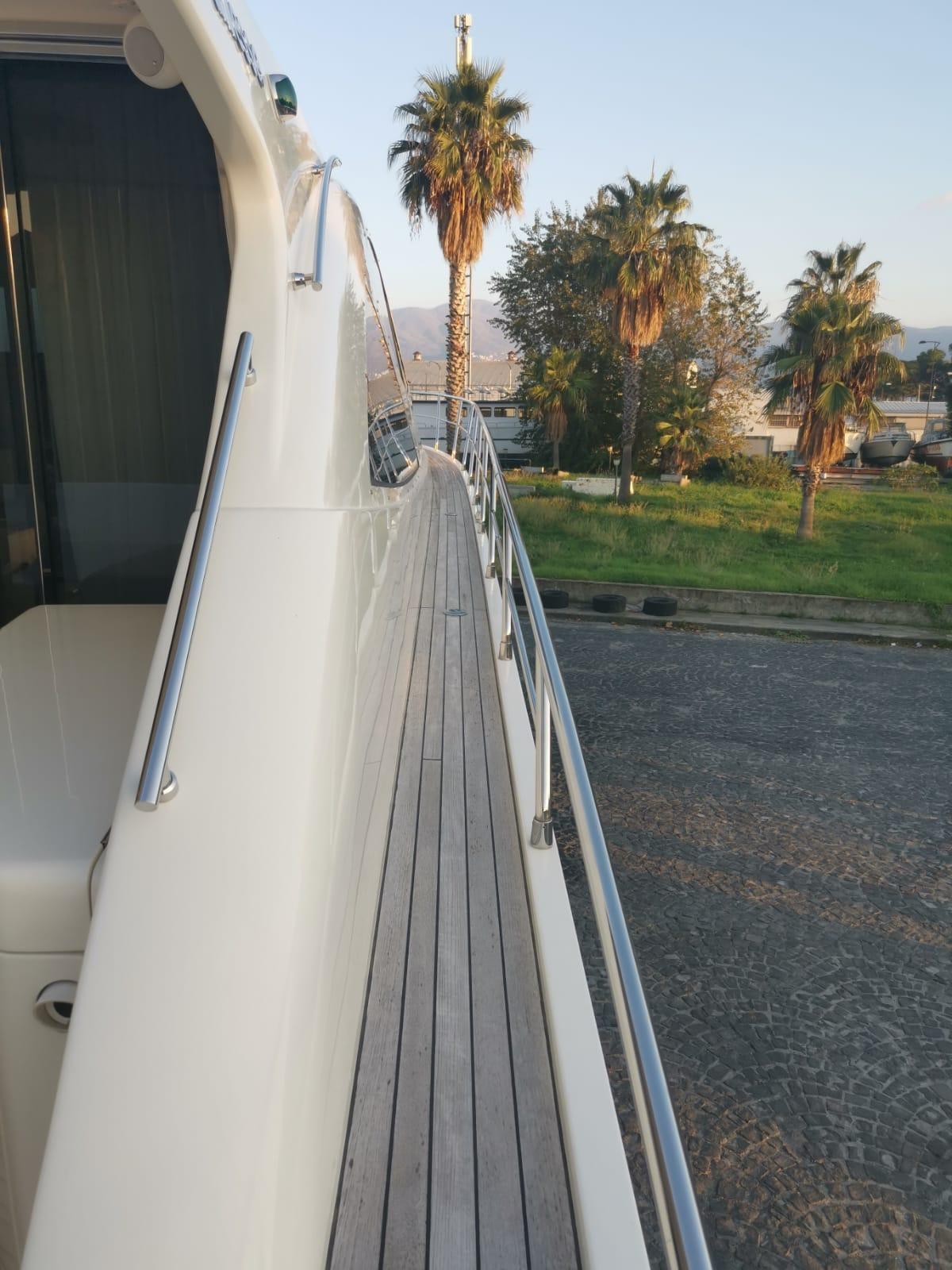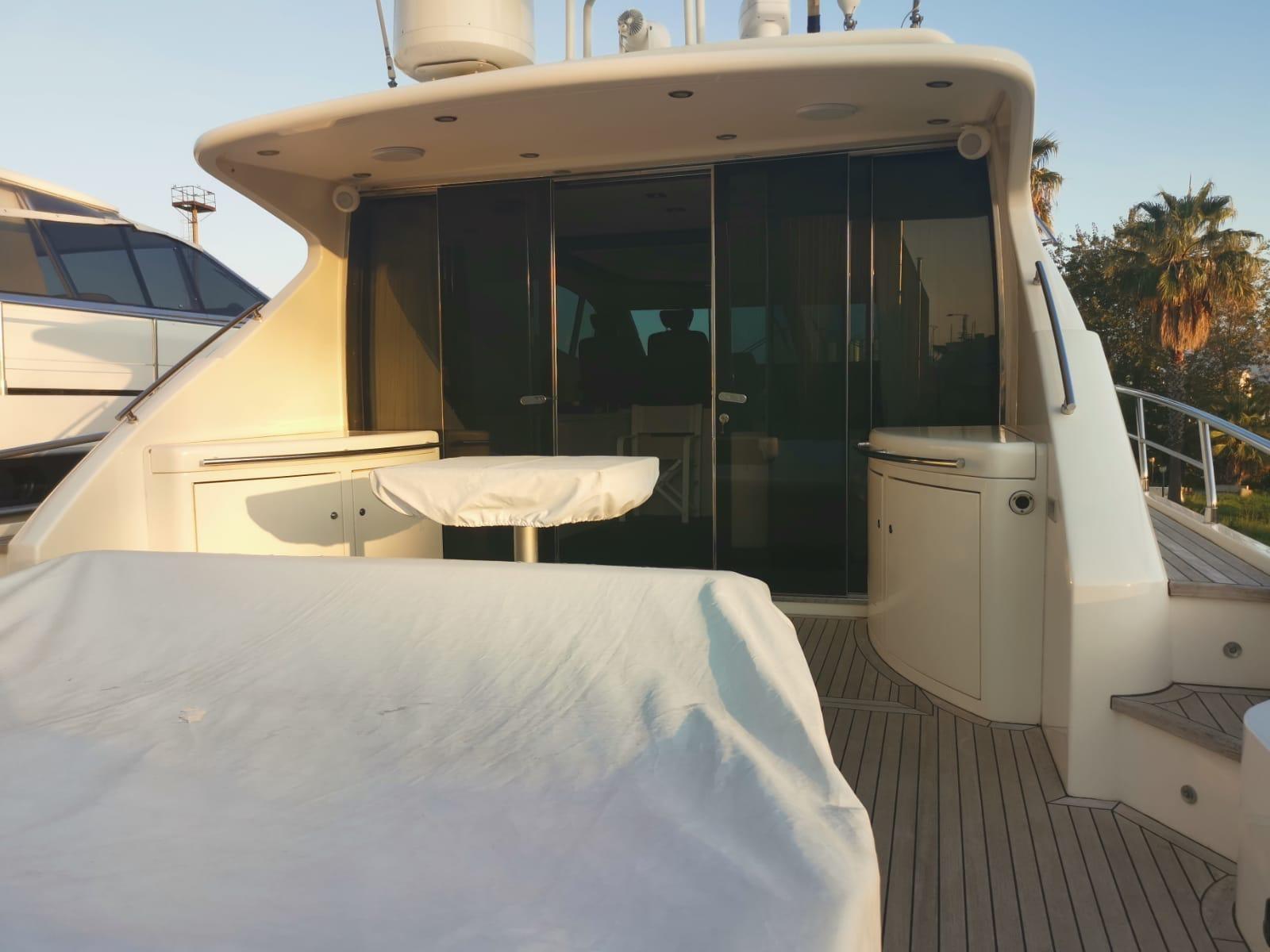 Allarme motore, Allarme sentina, Alternatore, Autoclave, Camminamenti laterali in teak, Doccia esterna, Flap idraulici, Hard top, Impianto antincendio, Indicatori Flaps, Lavandino nel Pozzetto, Luci subacquee, Passerella, Piattaforma, Pompa di sentina automatica, Pompa di sentina manuale, Ponte in teak, Porta ingresso, Pozzetto Teak, Presa 220V banchina, Presa acqua banchina, Salpa Ancore Elettrico, Scaletta da bagno, Selle per Tender, Tavolo pozzetto, Winch tonneggio di prua.