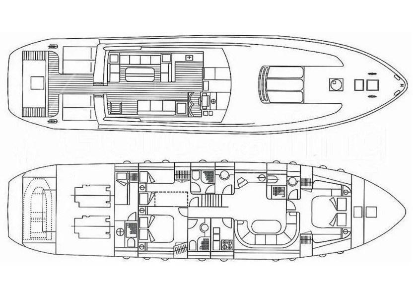 Cabina armatoriale con letto matrimoniale e bagno - cabina Vip con letto matrimoniale e bagno - cabina ospiti con due letti in piano, terzo letto pullman e bagno.