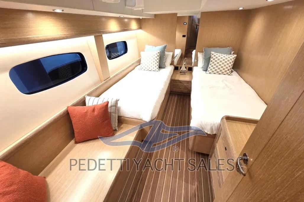 Allarme motore, Allarme sentina, Autoclave, 10 Batterie (4 motori (95Ah), 6 servizi (100Ah)), Cavo corrente di banchina, Corrimano, Doppia timoneria, 2 Flap elettrici (Zipwake), Impianto antincendio (sala macchine), Luci di cortesia, Monitor batteria, 6 Parabordi, Passerella (idraulica a scomparsa), Piattaforma (idraulica), Pompa di Scarico del Serbatoio Acque Reflue, 3 Pompa di sentina elettrica, Porta ingresso (teak), Pozzetto Teak, Presa 220V banchina, Presa acqua banchina, Ripetitore strumentazione, Salpa Ancore Elettrico, Scaletta da bagno, Tavolo pozzetto.
