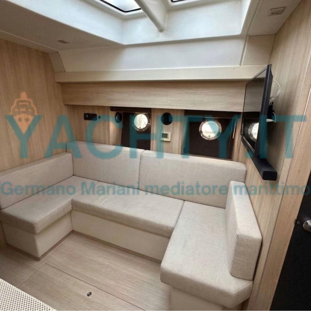 Gli spazi interni accolgono con un’atmosfera raffinata: **cabina armatoriale a prua con bagno privato, cabina ospiti a poppa con tre posti letto e secondo bagno**, oltre a una dinette elegante con cucina completa, pensata per vivere il mare con il massimo comfort.