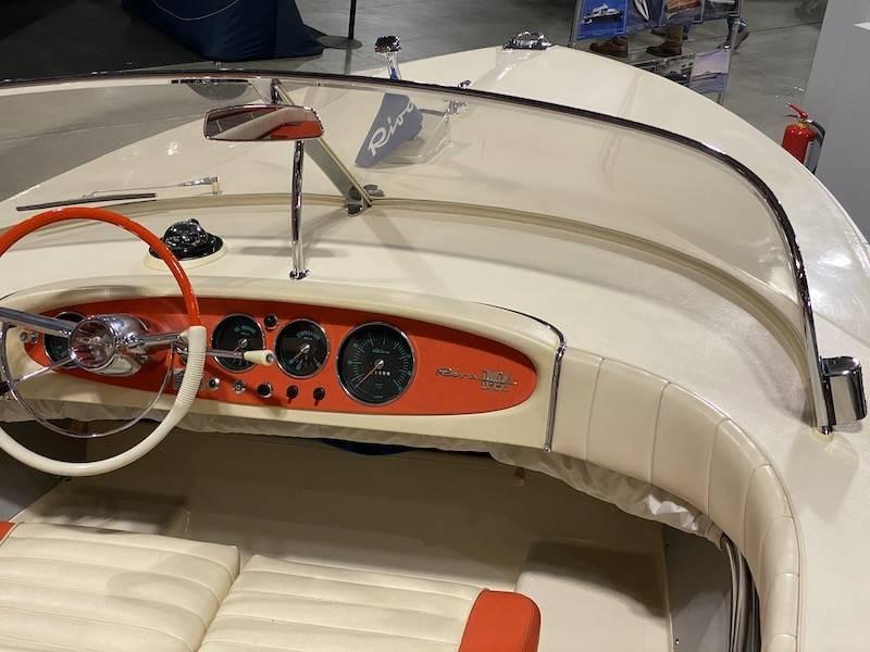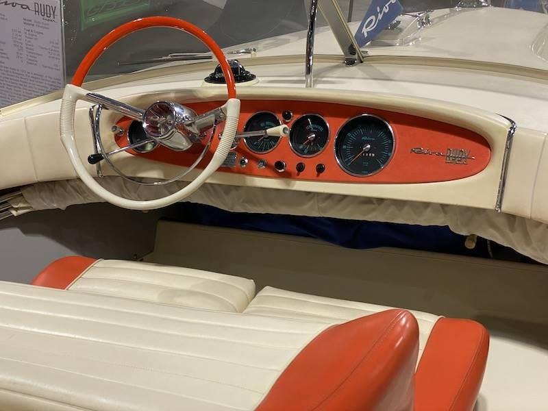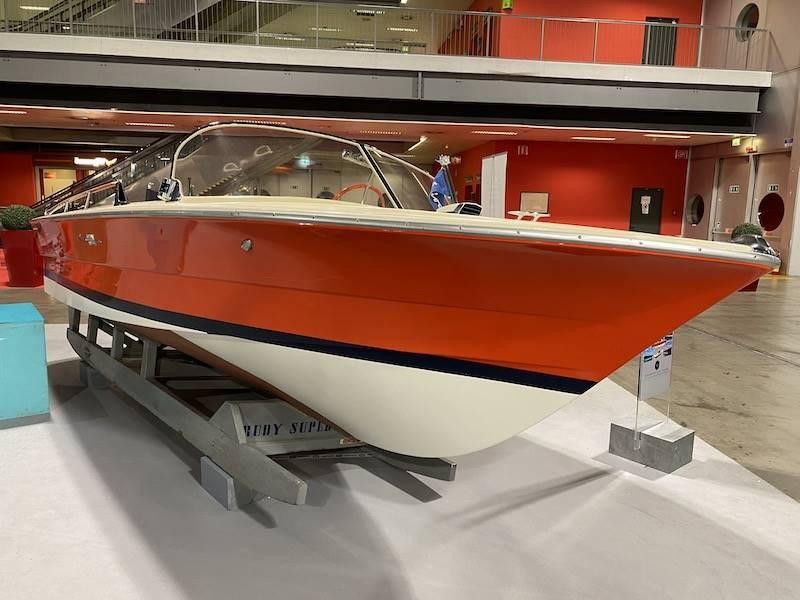 Il Rudy nasce nel 1972 come ridisegno dello Junior, con lo scafo allungato a m. 5,87 e largo m. 2,18, spinto da un motore Riva da 190 HP. Il # 1 venne costruito interamente in legno, come modello, dal # 2, il Rudy è in vetroresina, ma col pagliolato in legno, dal # 11 anche il pagliolato sarà in fiberglass. Rimangono in mogano, conferendo alla linea del Rudy un tocco di eleganza in più, solamente i corrimani laterali, i piani coprimotore ed il vassoio portaoggetti alle spalle del sedile di guida. Rimane in produzione fino al 1983, con la sua versione più potente da 210 hp, il Rudy Super, dalle murate arancio. Questo Rudy Super è in eccellenti condizioni ed ogni parte è originale Riva, ha avuto solo 2 proprietari. Questi i lavori eseguiti nel 2020: motore originale sbarcato e revisionato completamente. parti in mogano portate a zero e riverniciati con 22 mani (ciclo Riva). Cuscineria, sedili e prendisole nuovi. Strumenti motore revisionati. Guarnizioni parabrezza nuove. Serbatoio e linea benzina puliti e revisionati.Tutte le cromature e lo scafo lucidati.