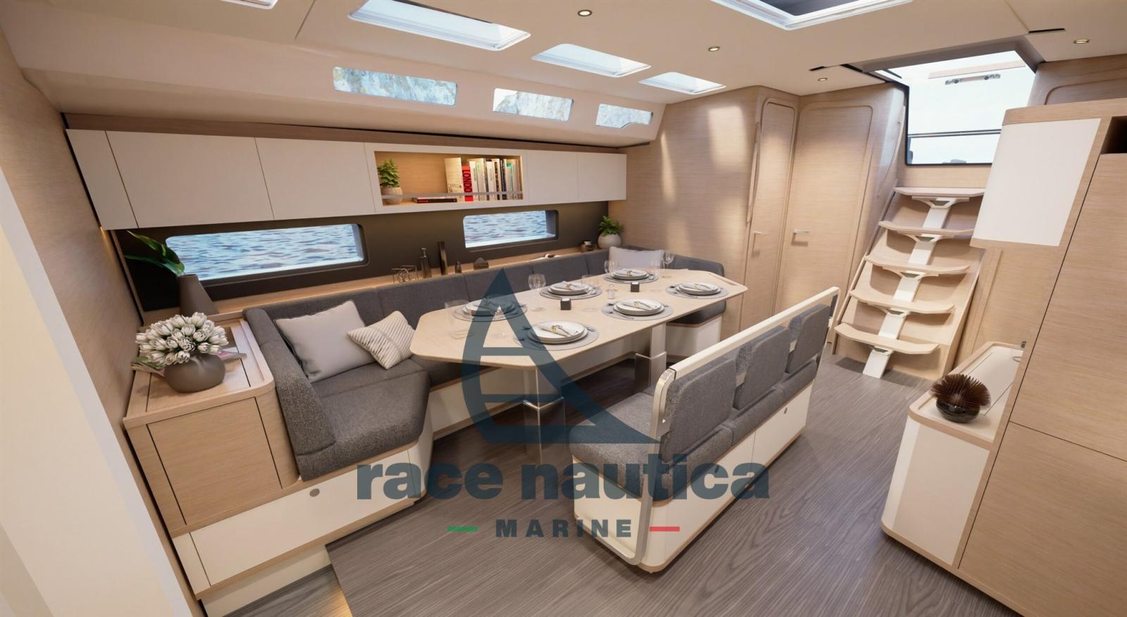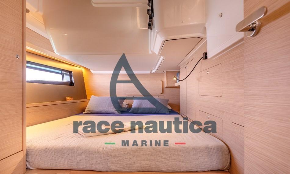 Pullman instead of storage on the left, tunnel bow thruster, Yanmar 80hp saildrive engine, lazy bar, lazy jacks, mainsail with battens and self-tacking jib, rigid vang, mainsail sheet on the deckhouse without transom, reefing lines led to the cockpit, cockpit shower (hot/cold), cockpit table with storage, 2000w windlass, 90A battery charger, 220v system, shore and boat power sockets, 1600w inverter, 40l boiler, electric seawater pump, automatic fresh water pumps, padded bed headboard in the forward cabin, Dacron genoa instead of self-tacking jib, 2 T50 winches aft, genoa tracks + sheets, 2 more T50 winches on the guardrail for German system with mainsail sheet, gennaker equipment, RA 70 Bluetooth Fusion stereo system with 2 speakers in the cockpit and 2 in the dinette, gas barbecue at the stern, sink, sprayhood with handrail, induction charger for mobile phones, electrically assisted opening from the stern platform, outboard motor support, cockpit cushions with backrests, a Triton model 2 repeater on the left and a Triton model 2 multifunction repeater on the right, VHF V100, autopilot with hydraulic piston, 9" Zeus 3 GPS chartplotter on the right on the instrument panel in place of the Triton 2 repeater, hull preparation + black antifouling, T50 electric winch on the deckhouse on the right, foldable bimini, stainless steel bow protection, anchoring kit, difference for 50 metres of chain instead of rope, standard interiors, electric WC in the bow.