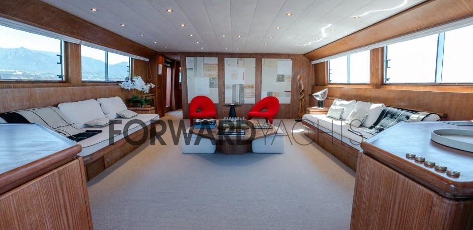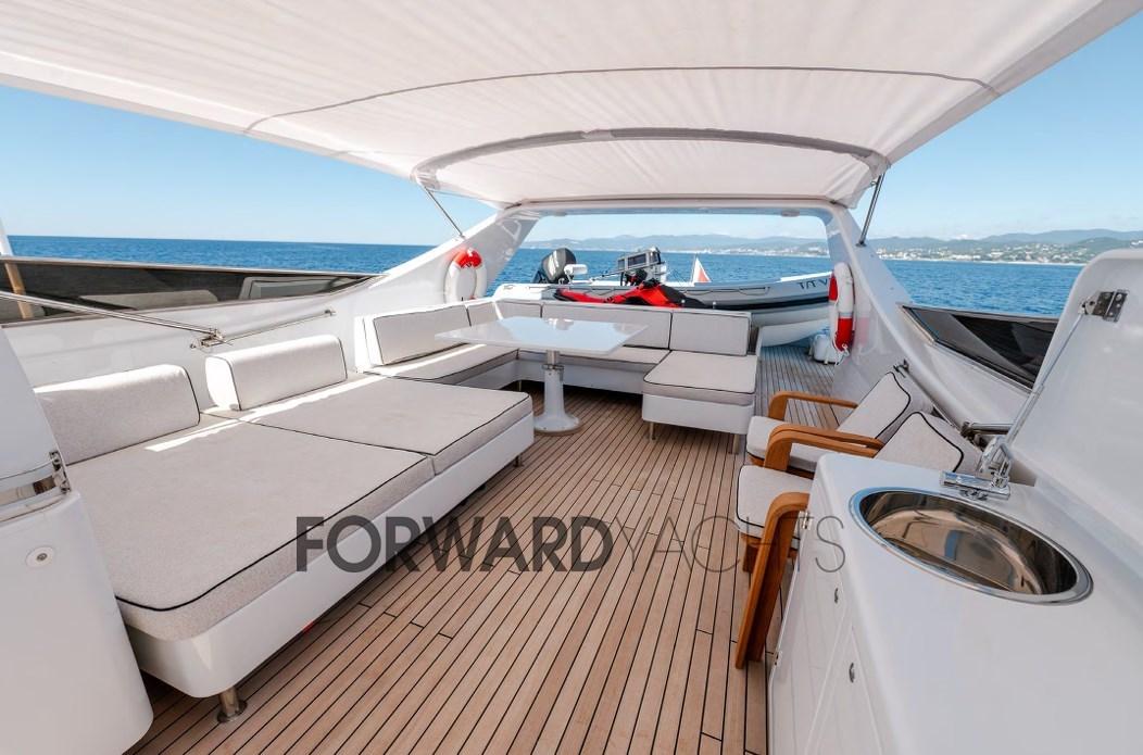 Lo yacht è suddiviso in tre ponti: dalla passerella di poppa si accede ad un grande pozzetto. I camminamenti laterali conducono alla prua con un ampio sun-deck dotato di un grande sofa bed.