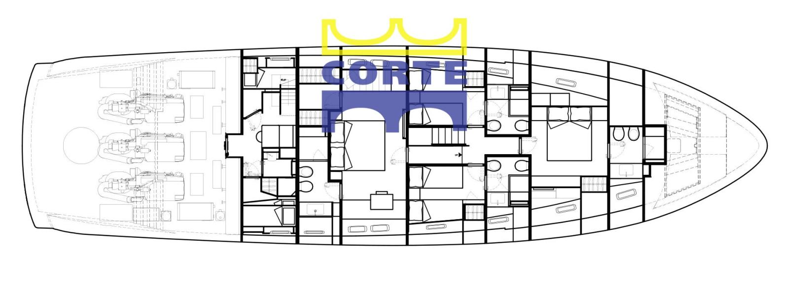 Pavimento in parquet in salone, dining area, gradini fly, gradini lower deck.