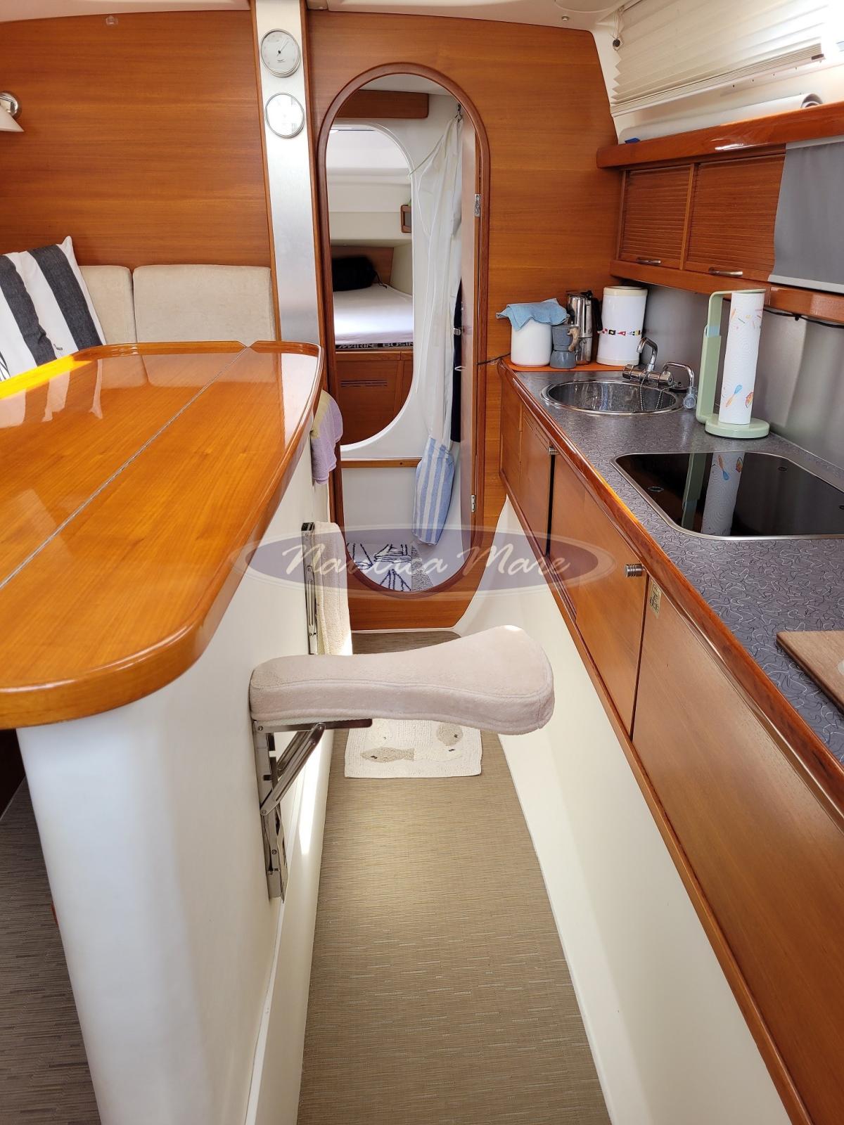 Interni: cabina a prua ed ampio letto matrimoniale a poppa (non diviso da paratia e da porta di accesso). 1 bagno con doccia. 4 + 2 posti letto totali. Cucina a gas con 2 fuochi. Dinette molto ampia con lungo tavolo centrale con sedute a divanetto sulla sinistra e sedute a scomparsa sulla dritta per permettere un agevole passaggio da poppa a prua. No calavele ma gli scafetti laterali hanno ampi spazi per lo stivaggio e sono stagni.