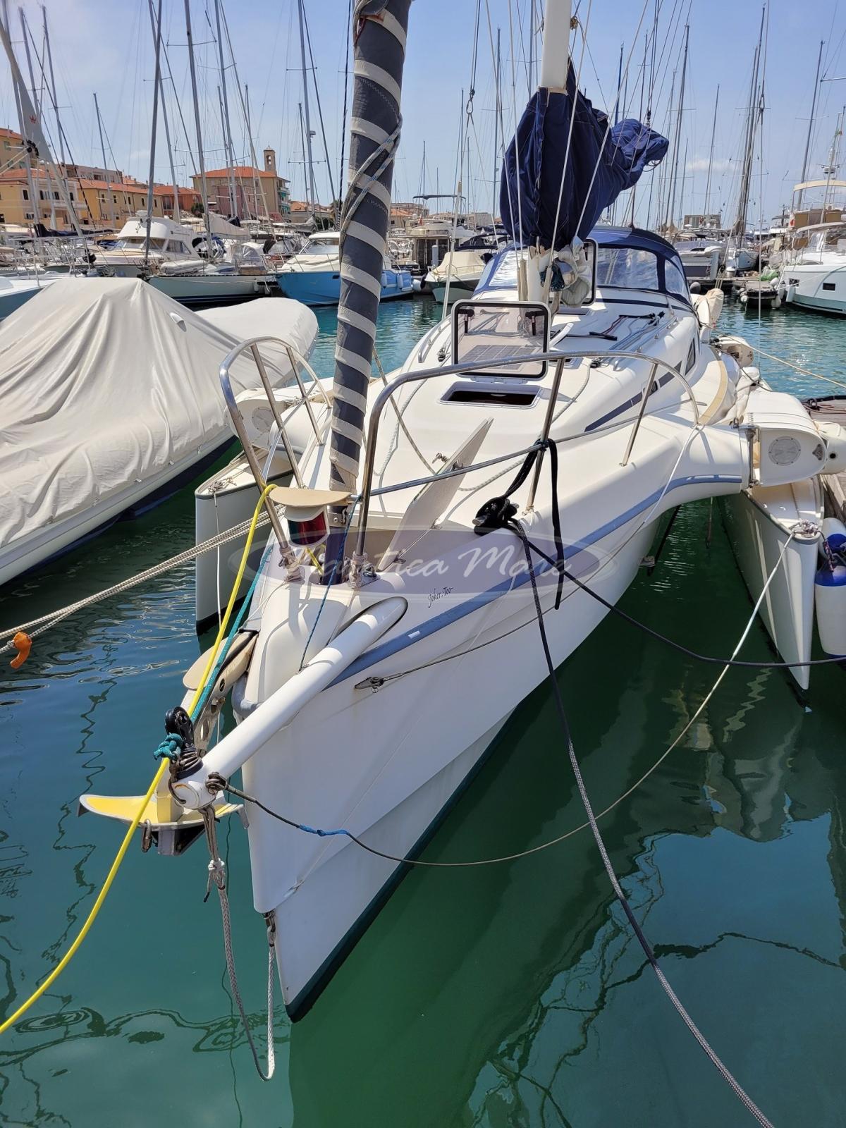 Costruzione in sandwich con resina vinilestere, core interno in schiuma. Colore scafo bianco. Armo Sloop con albero in carbonio di 16 mt. Sartiame spiroidale in Dyform originale (sostituito solamente lo strallo di prua). Randa Elvstrom in laminato, 54 mq. (la vela è stata riparata per parziale delaminazione ma ancora utilizzabile, da considerare la necessità di sostituirla). Vele di prua: Genoa di 30 mq. in laminato, ancora in buone condizioni. Winch: 1 Andersen da 46 elettrico; 2 Andersen per fiocco da 36 self tailing; 2 per trasto randa da 30 self tailing; Lazy Jack: Si; Lazy bag: Si (sostituito nel 2025). Note: Code 0 da 50 mq. in ottime condizioni; Gennaker da 95 mq. in ottime condizioni; Bompresso in carbonio estraibile da 1,5 mt. Tutte le manovre sono asservibili con opportuni rimandi e stopper al winch elettrico. In dotazione anche 2 preventer parancati contro strambate involontarie. Inoltre: 1 barra timone originale ed una seconda in termanto e pelle in carbonio con prolunga.