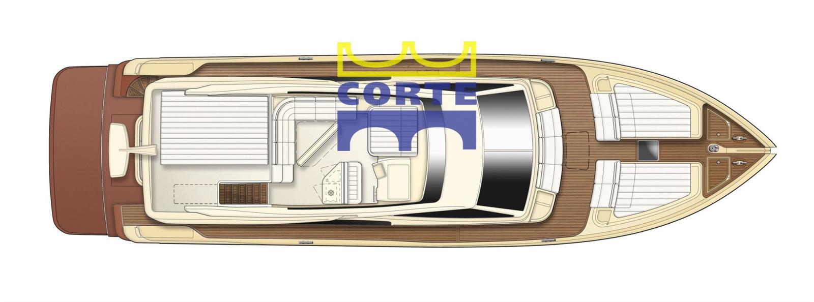 Sul flying bridge sono stati posizionati due prendisole, uno molto ampio verso poppa e uno verso prua a fianco della postazione di guida. Divano a L, tavolo fisso e zona frigo e grill completano il fly.